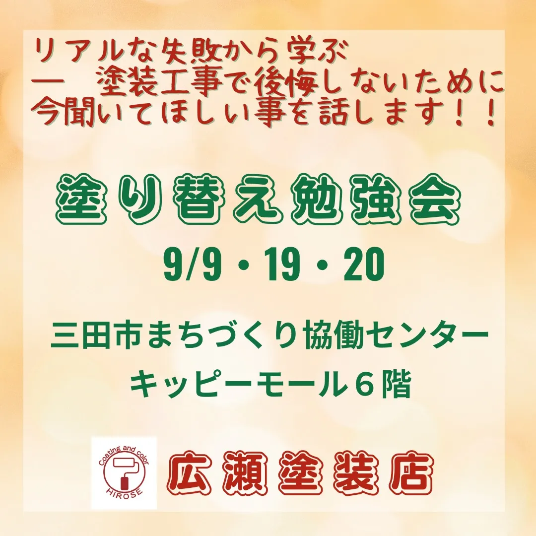 【終了】9月外壁・屋根塗り替え勉強会~失敗しない外壁塗装の基礎知識~ 三田市・神戸市北区・西宮市北部地域密着の戸建て住宅専門外壁塗装店、広瀬塗装店です9月の塗り替え勉強会もたくさんの方にご参加いただきありがとうございました!★★9月塗り替え勉強会開催のお知らせ★…