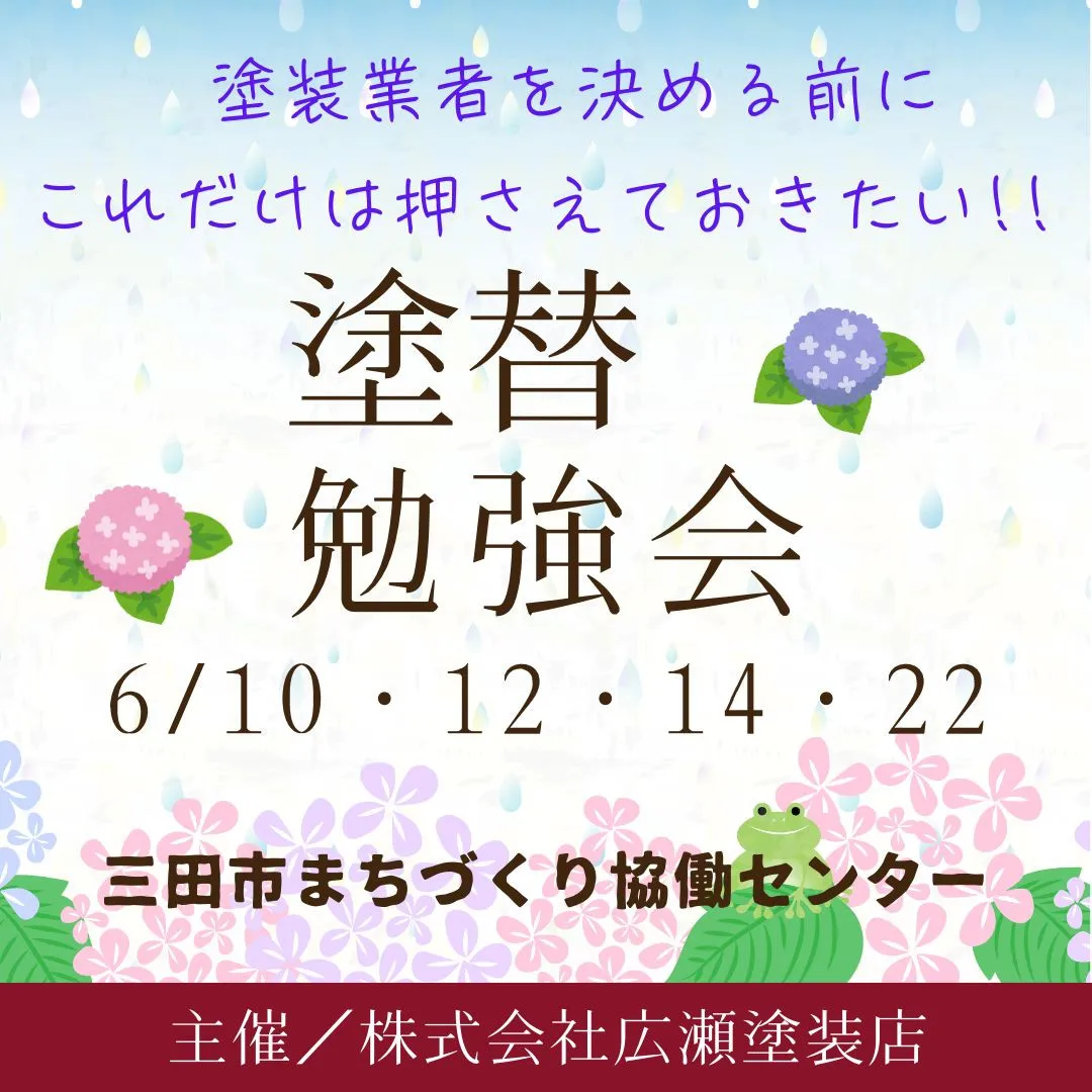 【終了】6月塗り替え勉強会のお知らせ(三田市) 神戸市北区・三田市地域密着の戸建て住宅外壁・屋根塗装専門店、広瀬塗装店です 6月の塗り替え勉強会は全日程終了いたしました。今月もたくさんのお客様にお問い合わせ、ご参加いただきありがとうござい…