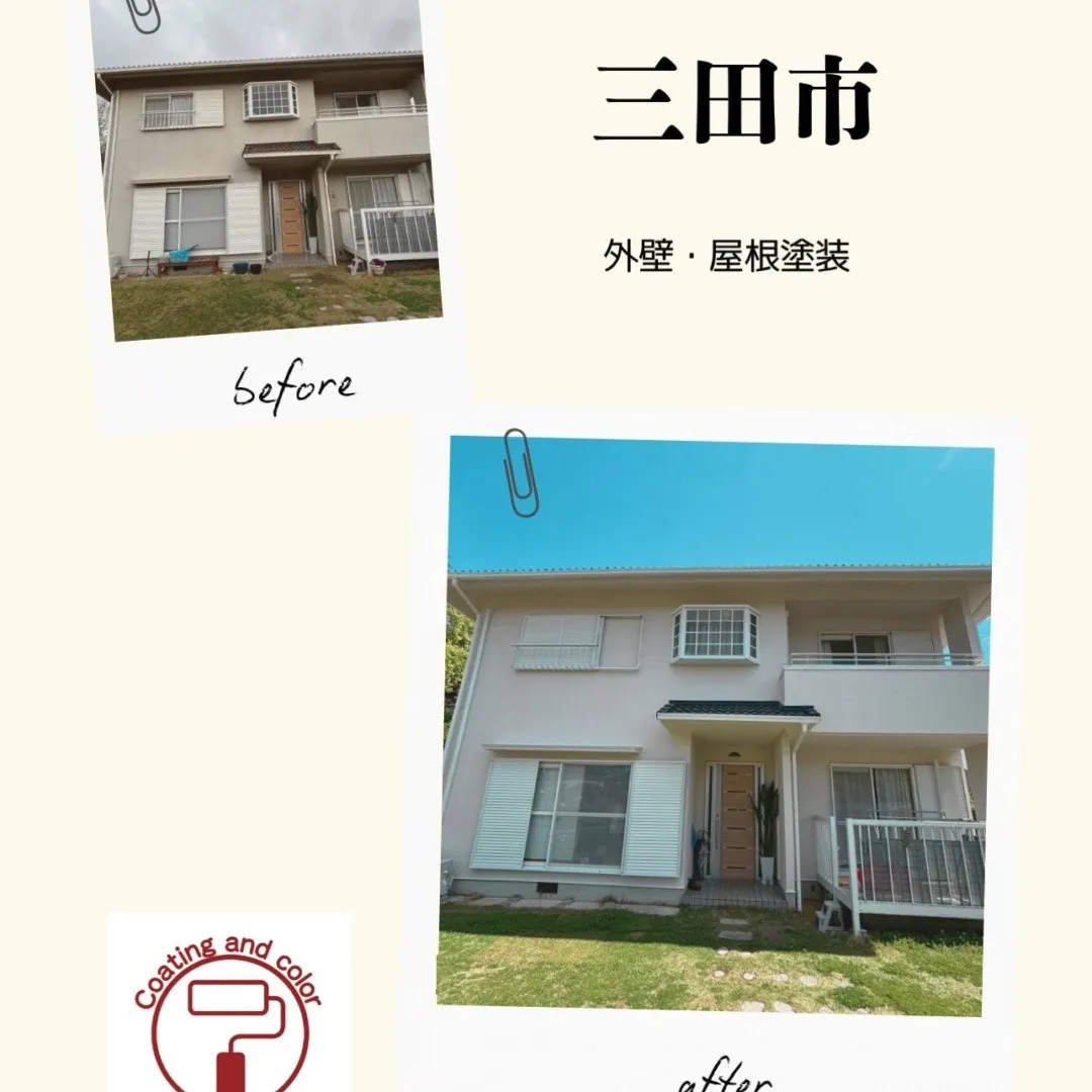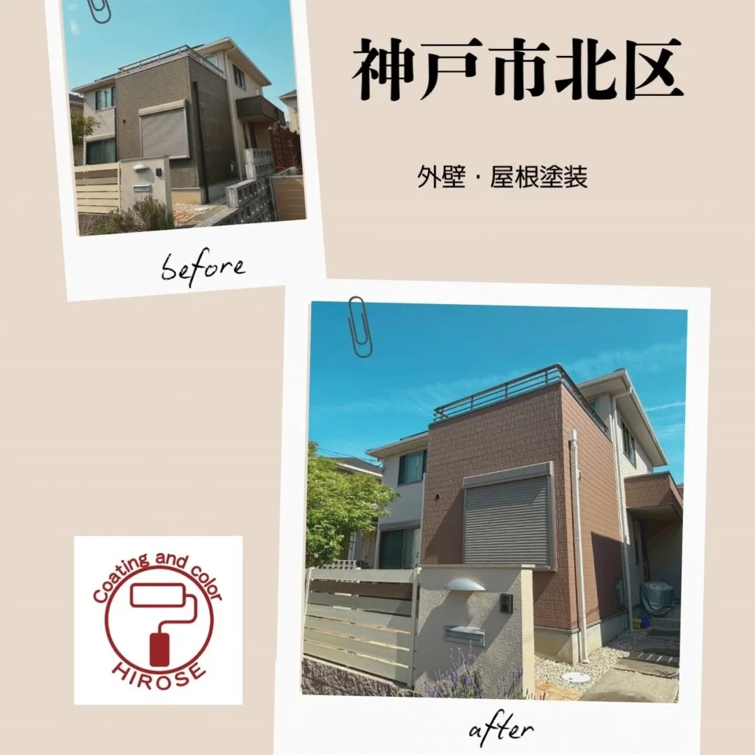 インスタ更新中!落ち着いたツートン仕上げのおうちに♪ 神戸市北区・三田市・西宮市北部地域密着の戸建て住宅専門外壁・屋根塗装店、広瀬塗装店です 落ち着いた雰囲気のツートン仕上げに 築16年、日当たりのよい南面外壁の色褪せが目立っていましたが、塗り替…