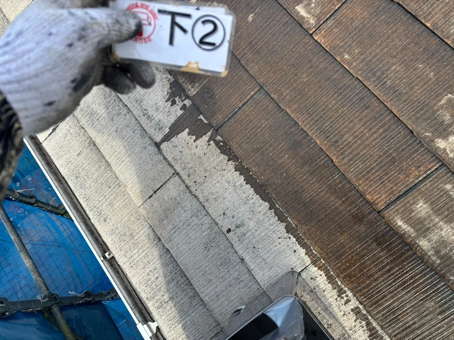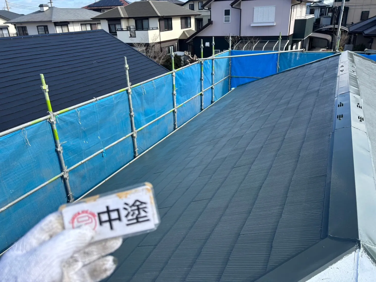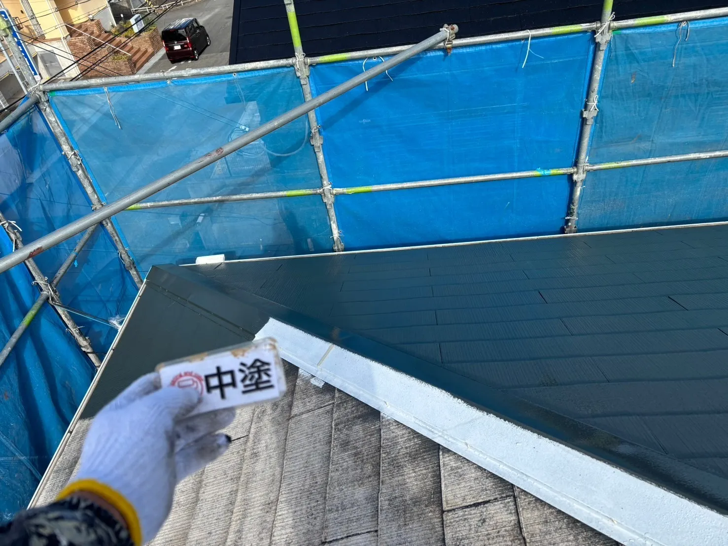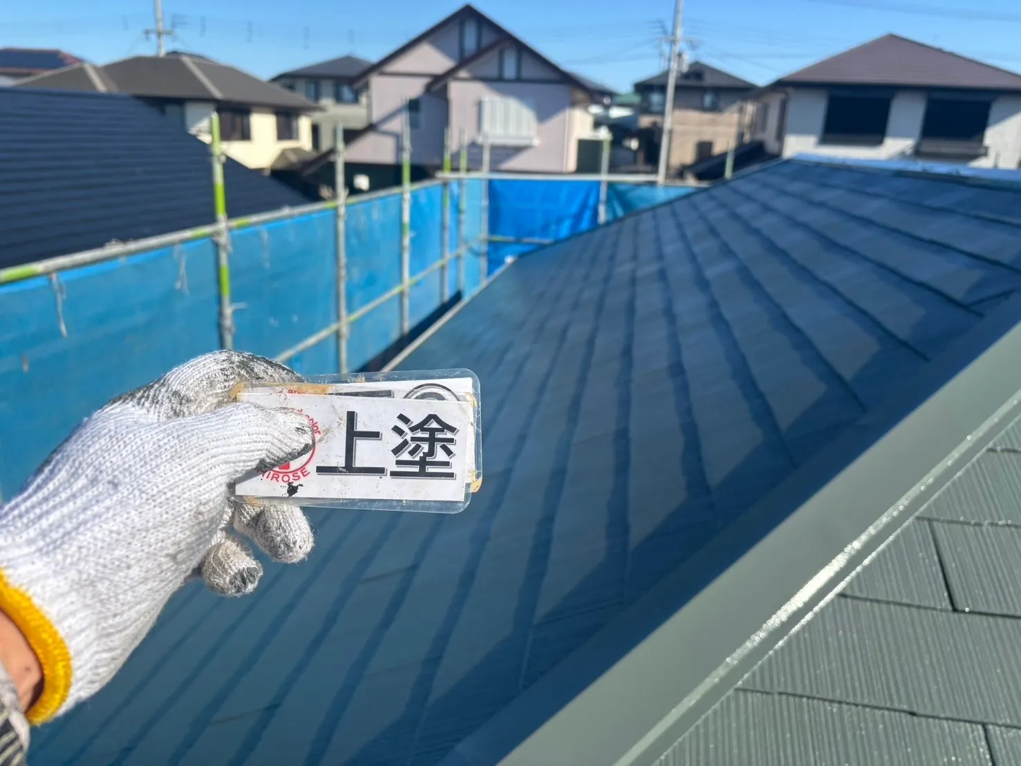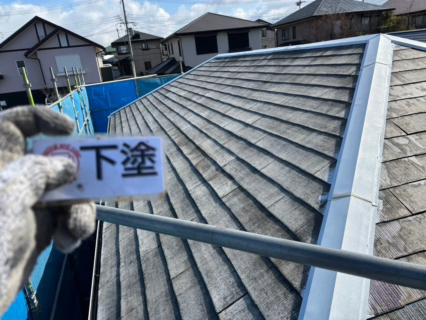 下塗りを2回行うことで、上塗り塗料の吸い込みを少なくし、塗料のつきも良くなります。また、塗料のツヤも出て、仕上がりに差が出ます。中塗りと上塗りはエスケープレミアム無機ルーフでおこないました。下塗り2回、中塗り、上塗りの計4回塗りで仕上げます。