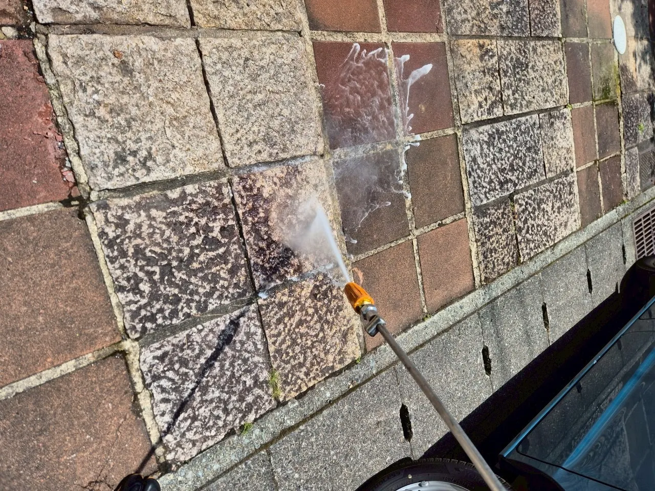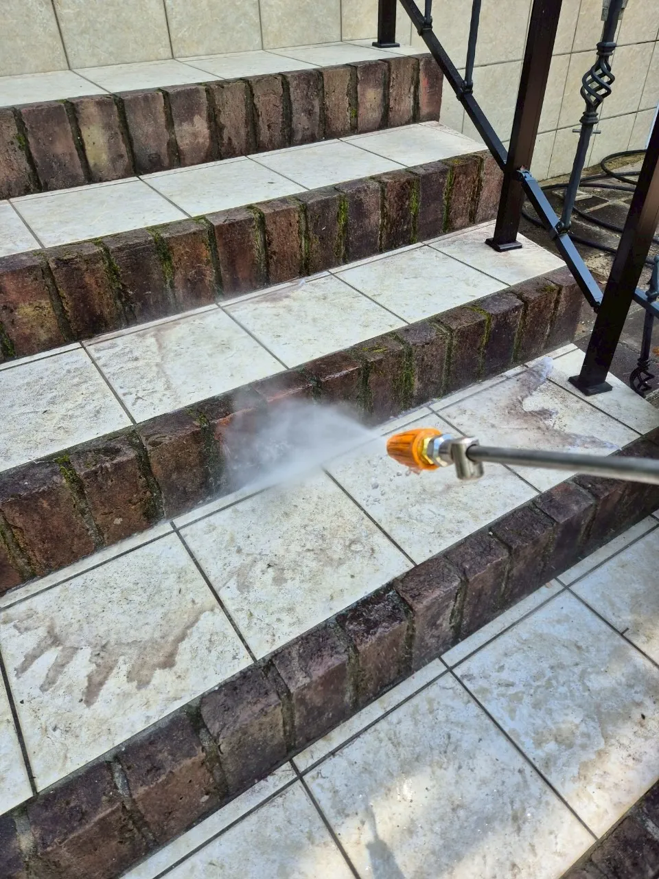 T様のお住まいでまず印象的だったのは、非常にお手入れの行き届いた素敵なお庭でした。私たちは、単に壁や屋根を洗うだけではありません。これから美しくなる建物に合わせて、玄関アプローチや土間部分まで高圧洗浄を行いました。
