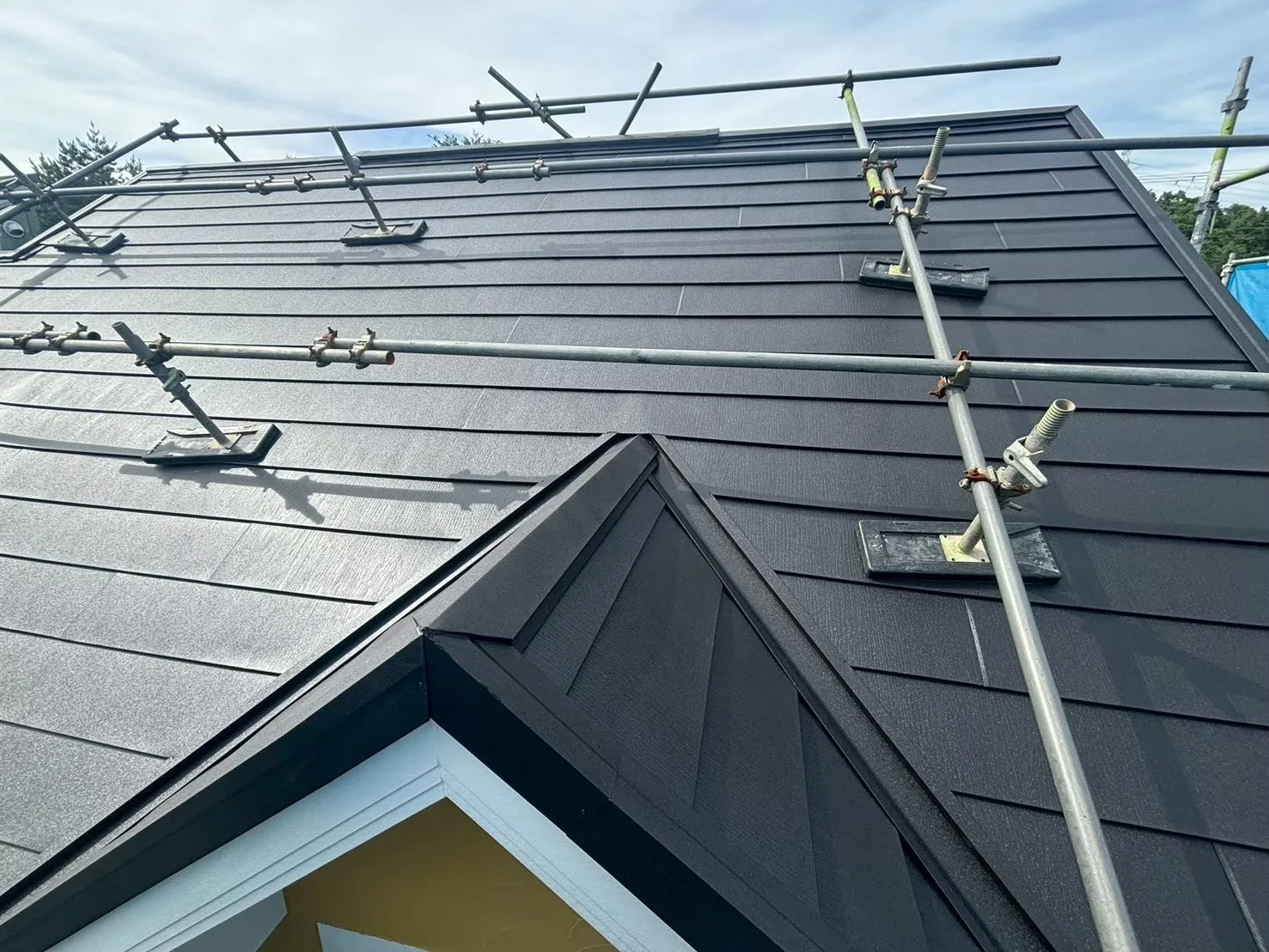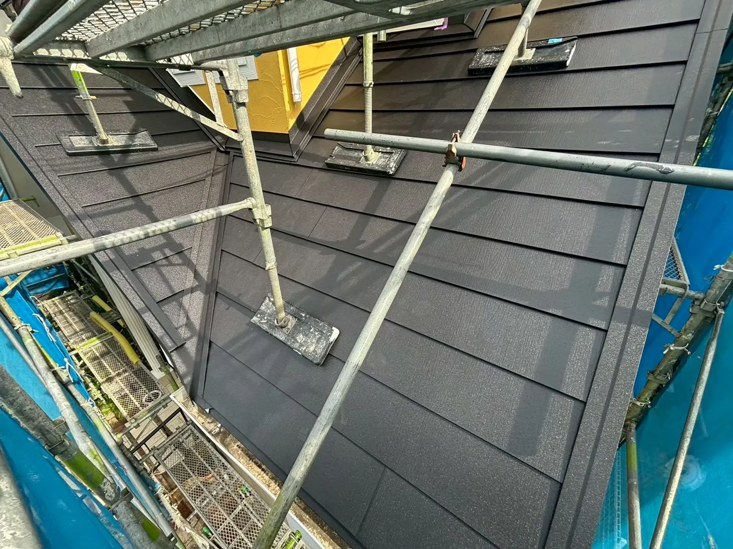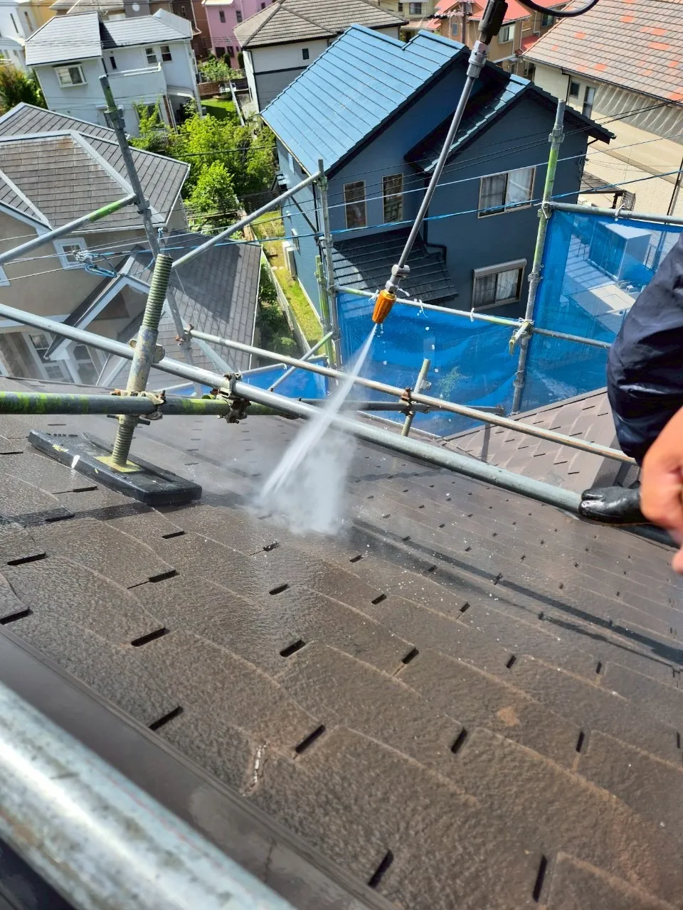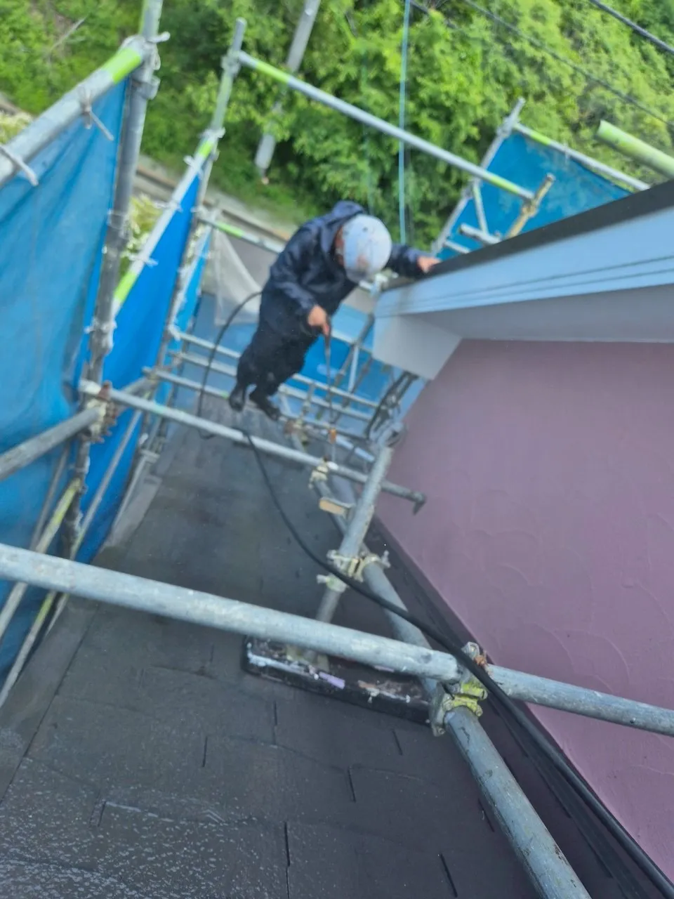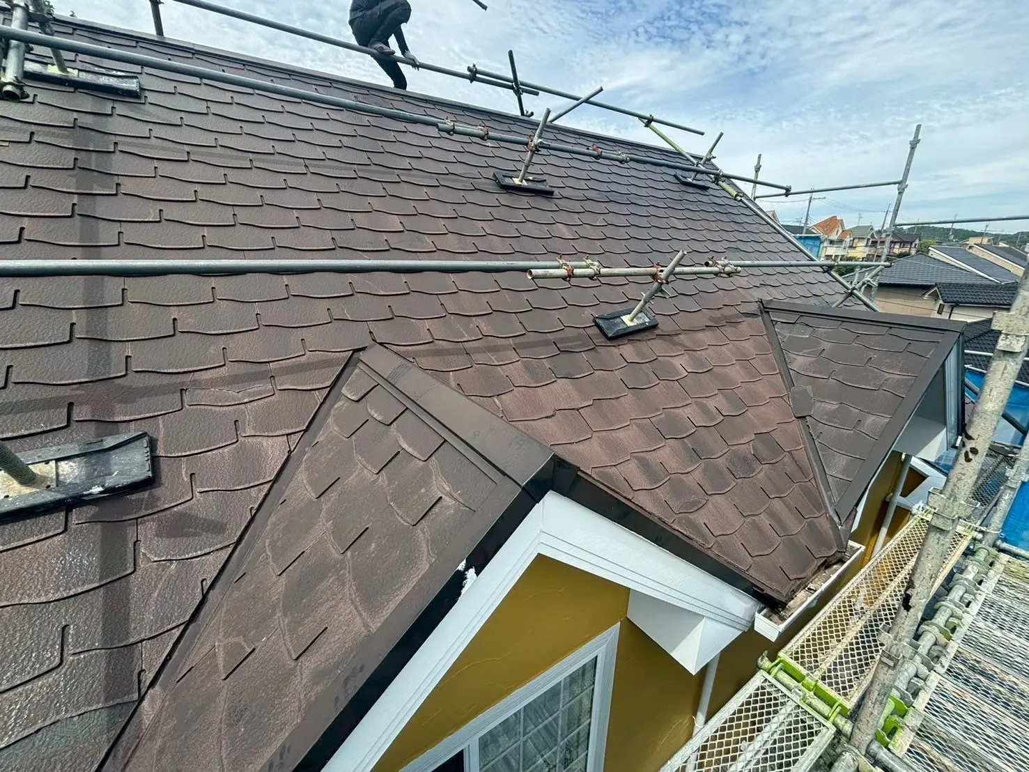 今回のメイン工事は屋根です。T様のお宅は屋根の傾斜が急な「急勾配」でした。職人が安全に作業し、かつ施工品質を確保するために、屋根の上にも専用の「屋根足場」を設置しました。ここを惜しむと、丁寧な作業ができません。