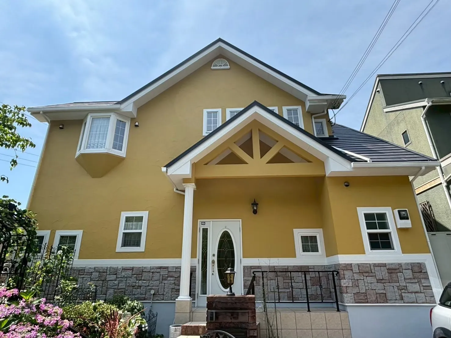 長年の汚れで黒ずんでいたアプローチが本来の明るさを取り戻すと、お庭の緑がいっそう映えるようになります。お忙しいT様が、ふと足元を見た時に気持ちよく過ごすために、塗装の品質を高めるのはもちろん、住まい全体の美観を整えることにも私たちは手を抜きません。