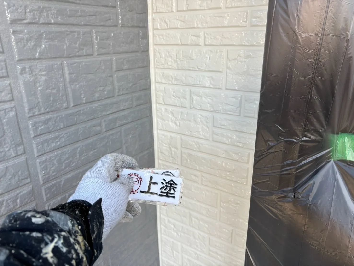 そして、特徴的でお洒落な多彩色サイディングボード部分には、色を塗りつぶしてしまうのではなく、既存の柄や色味をそのまま生かして保護する「クリヤー塗装」を施しました。今のデザインを気に入っているからこそ、その美しさを透明なベールで守り、新築時のような鮮やかさを蘇らせています。
