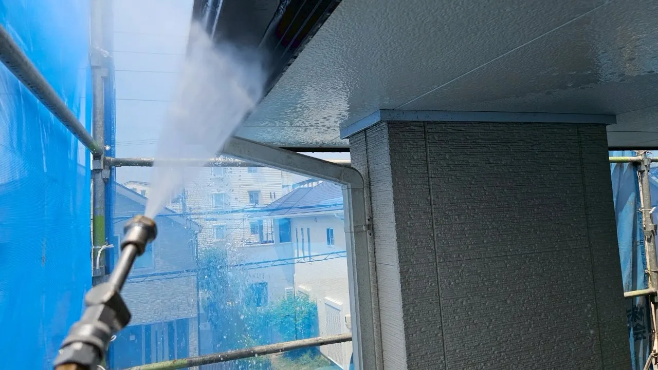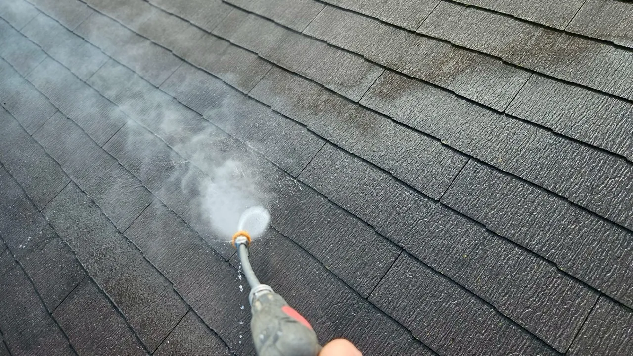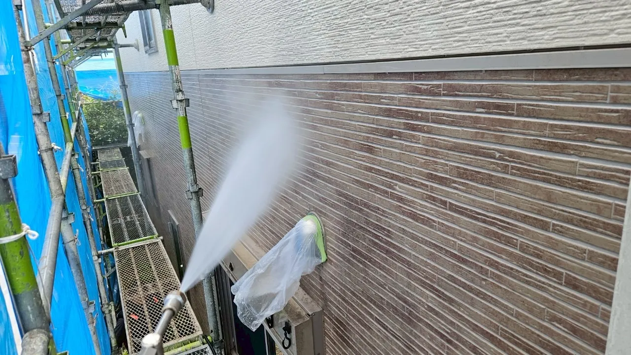 塗装工事において、最も重要と言っても過言ではないのが最初の「高圧洗浄」です。K様のお宅は築15年ということもあり、外壁や屋根には目に見えない汚れやコケが付着していました。これらを完全に洗い流さなければ、どんなに高性能な塗料を使ってもすぐに剥がれてしまいます。