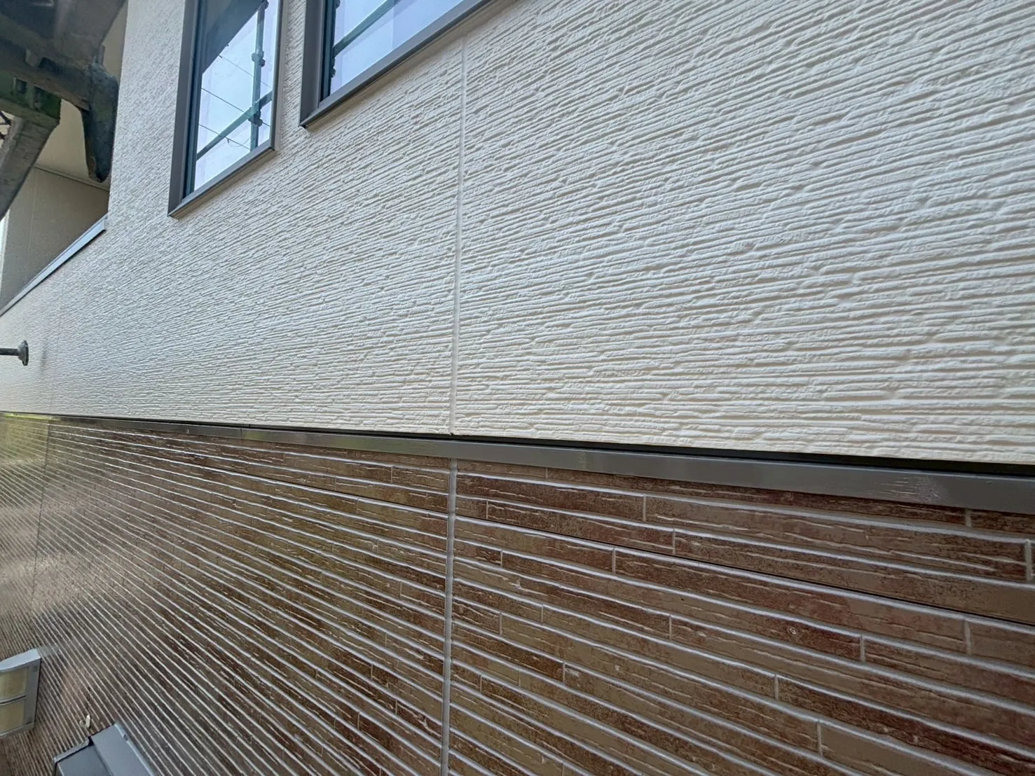「元のイメージと大きく変わらない色にしたい」というK様のご希望を叶えるため、外壁材の種類に合わせた塗り分けを行いました。白系のベース部分には、汚れにくくマットな質感が美しい「ナノコンポジットW(色:NC-10)」を採用しました。