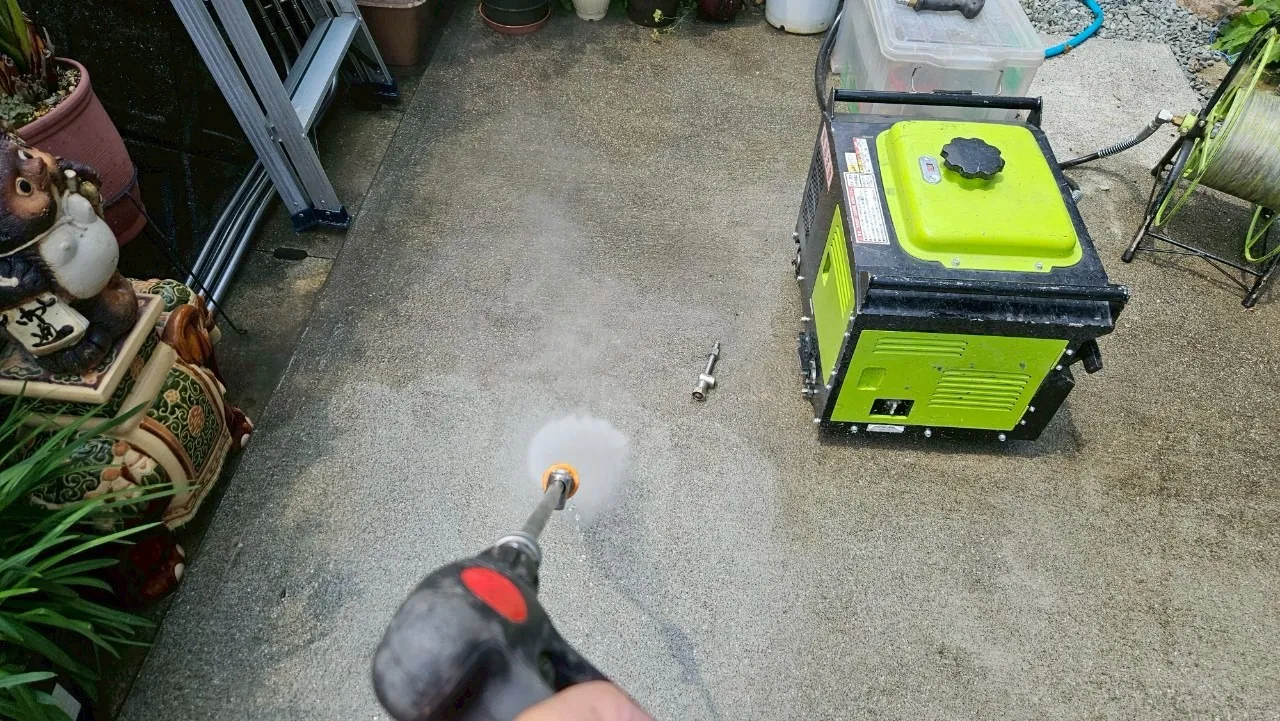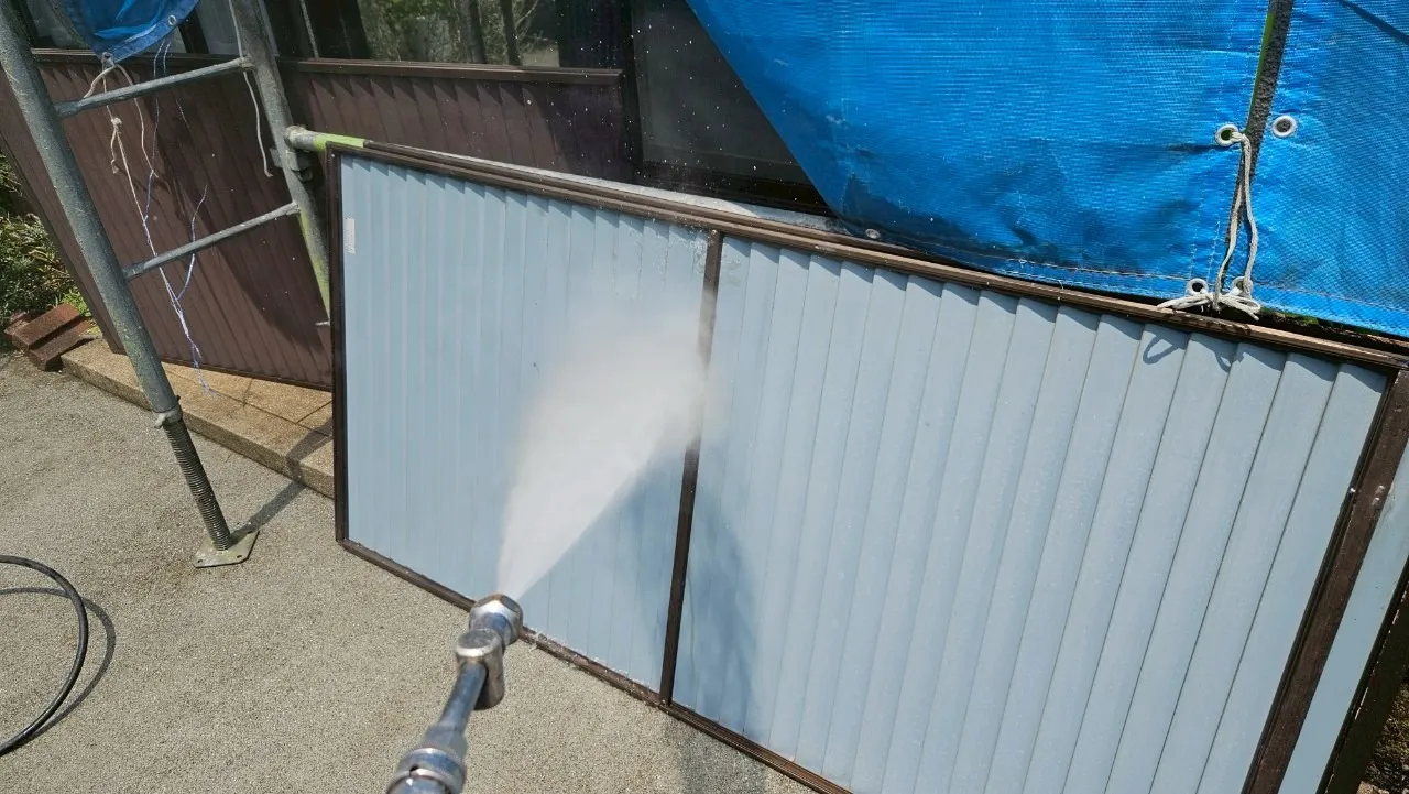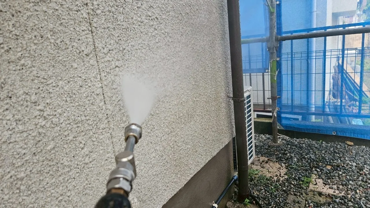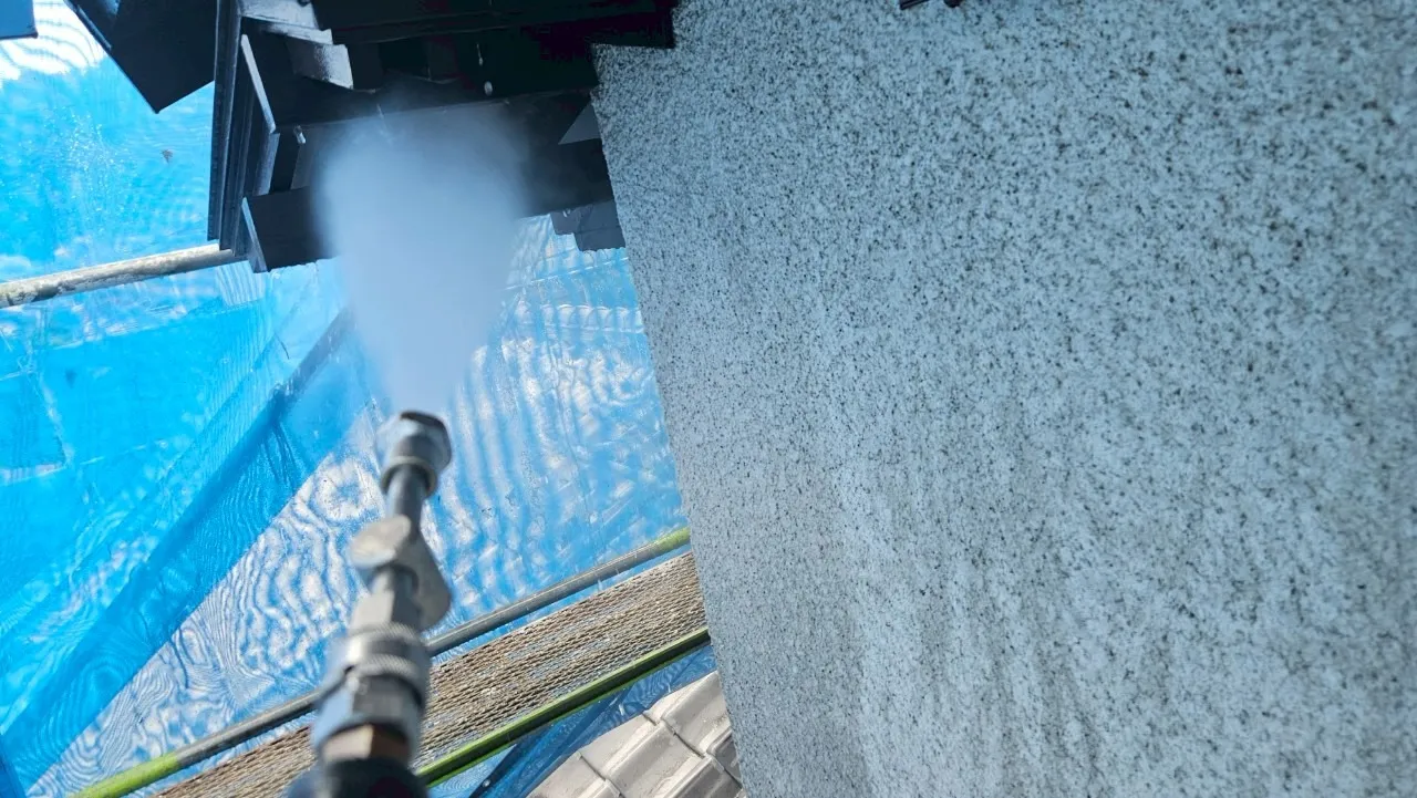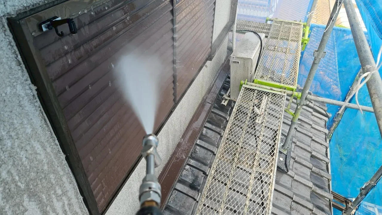 塗装工事において、塗料の性能を100%引き出すために最も重要なのが、最初の「高圧洗浄」です。K様のお宅は前回の塗装から18年が経過しており、一見きれいに見えても、外壁の表面には長年の埃や苔、排気ガスなどの汚れがびっしりと付着していました。