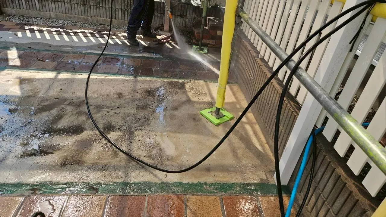 私たちは高圧洗浄機を用いて、劣化した古い塗膜や汚れを根こそぎ洗い流しました。特に今回は、後にご説明する「透湿性」の高い塗料を使用するため、下地を清潔に整えることが非常に重要です。15日間の工事の第一歩として、妥協のない洗浄を行いました。