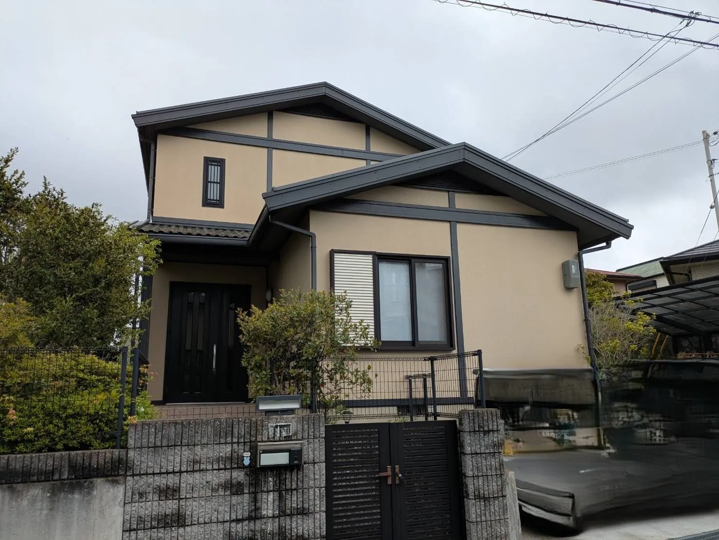 18日間の工事を経て、足場が解体された瞬間、そこにはK様が思い描いていた理想の姿がありました。「現状のイメージを大きく変えたくない」というご希望通り、住み慣れた我が家の雰囲気はそのままに、気になっていたひび割れや汚れは一掃され、まるで新築時のような輝きを取り戻しました。明るくリフレッシュされた外壁と、黒く引き締まった屋根・付帯部のバランスは完璧です。