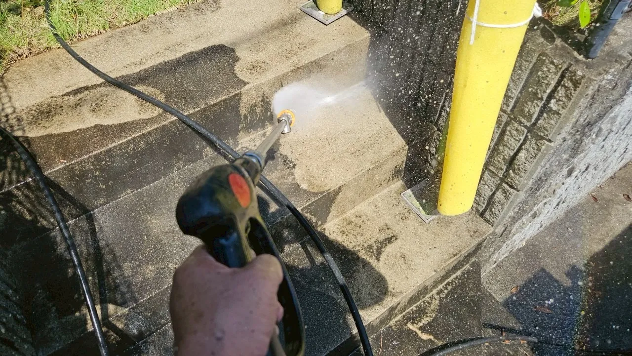 塗装工事において、最も地味でありながら、仕上がりの寿命を決定づける工程をご存知でしょうか?それが「高圧洗浄」です。K様のお住まいは築29年。一見きれいに見えても、外壁の表面には長年の紫外線による古い塗膜の粉(チョーキング)や、排気ガス、カビ、コケなどの汚れが深く蓄積していました。これらを残したままでは、どんなに高性能な塗料を塗っても、その真価を発揮することなく数年で剥がれてしまいます。