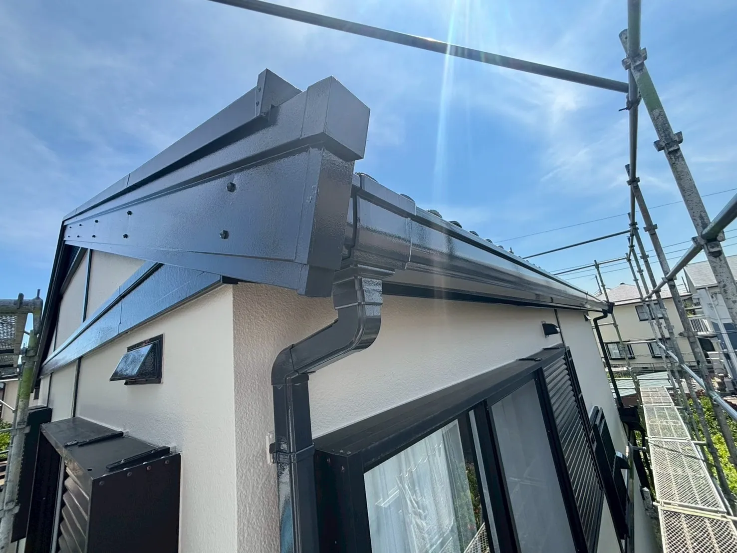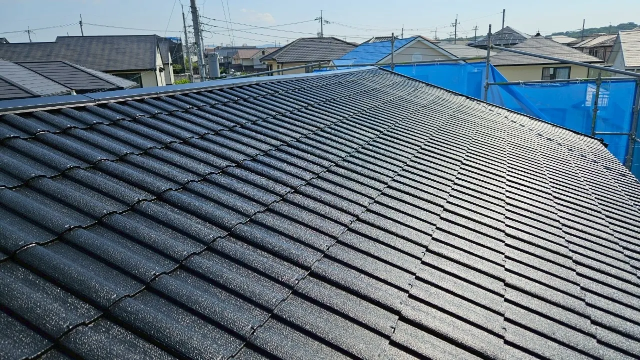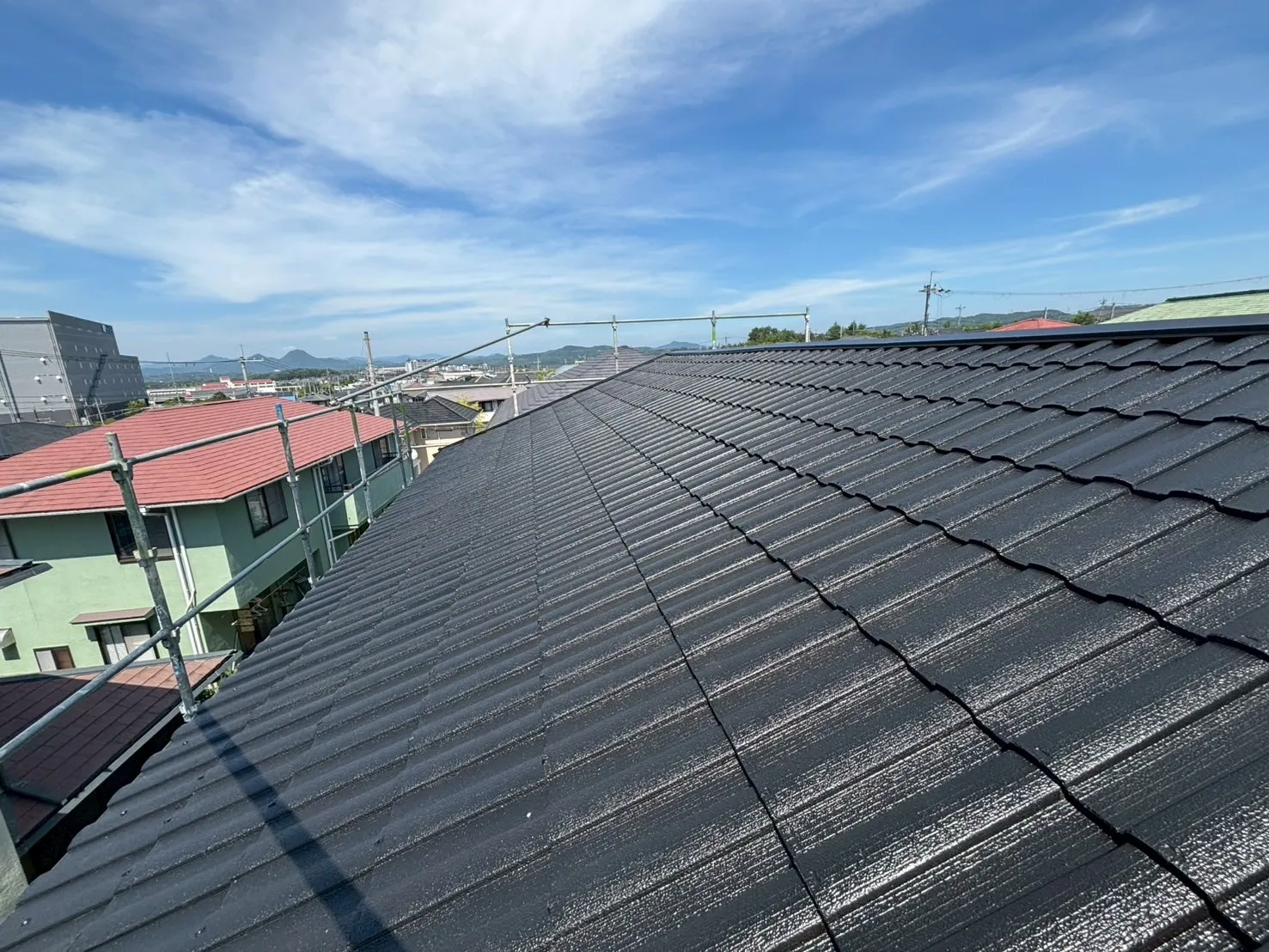 施工においては、まず下塗りに「水系パワーシーラー」をたっぷりと浸透させ、傷んだ屋根材を強化してから上塗りを行いました。色はK様ご指定の「黒」。屋根を深みのある黒で引き締めることで、家全体のシルエットに重厚感と安定感が生まれます。普段は見えない場所だからこそ、妥協のない最高品質の塗料と、基本に忠実な施工プロセスで、家を一番上から守り抜く覚悟を込めました。
