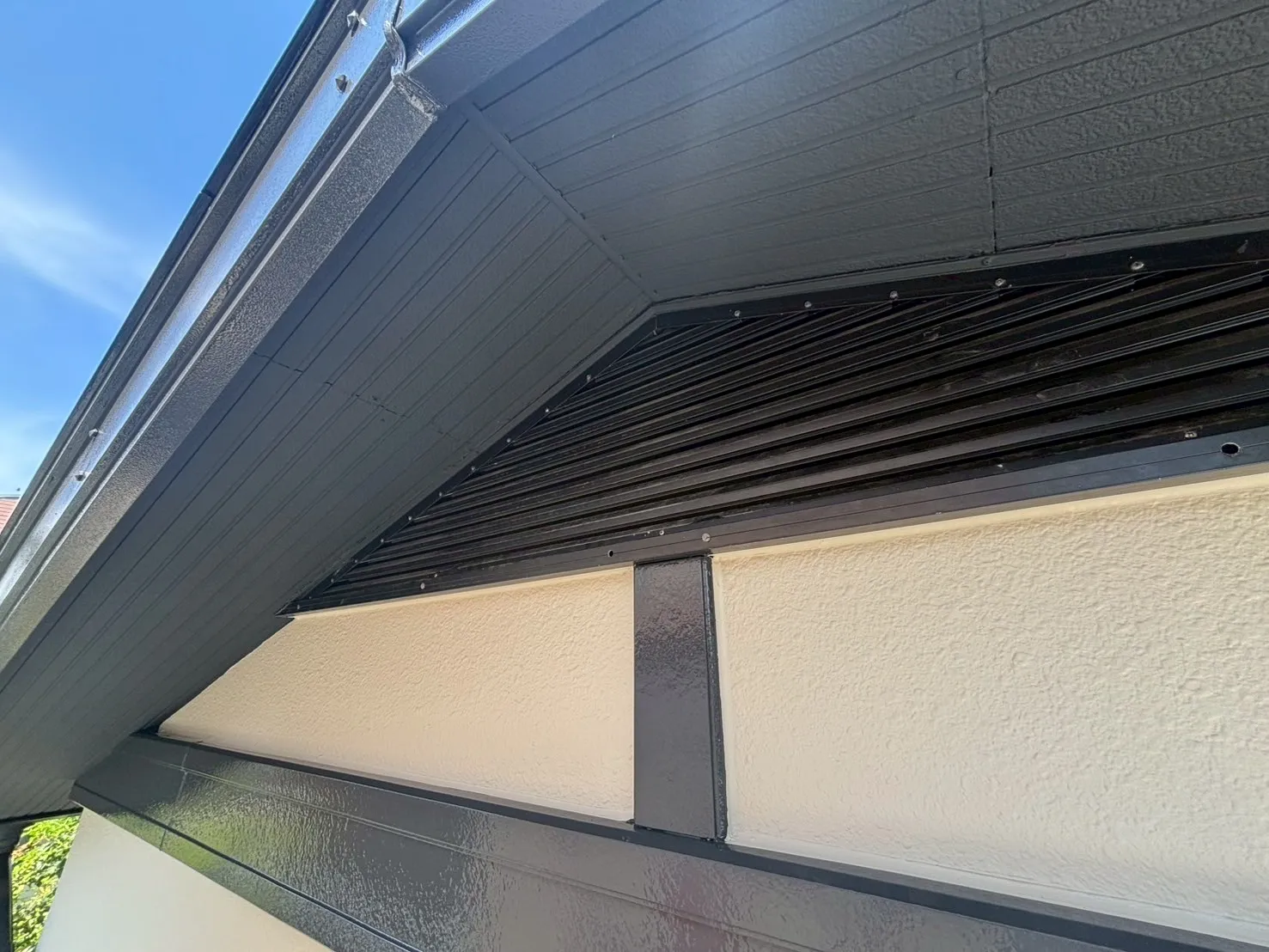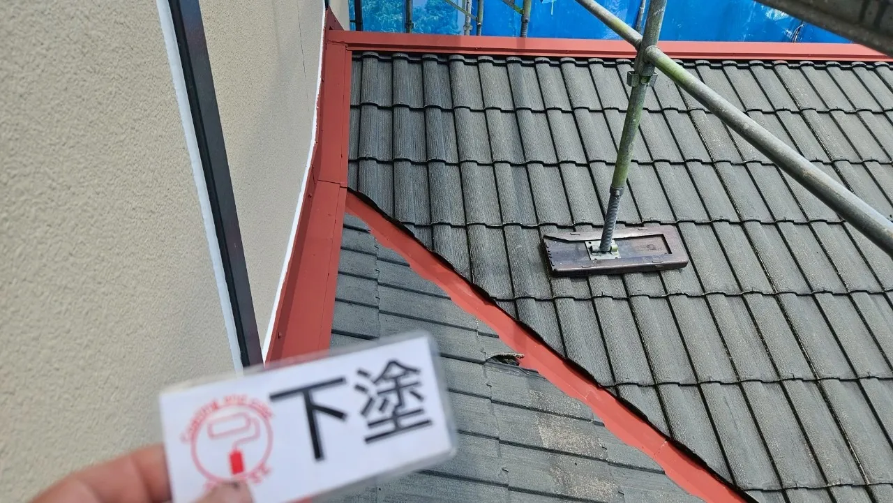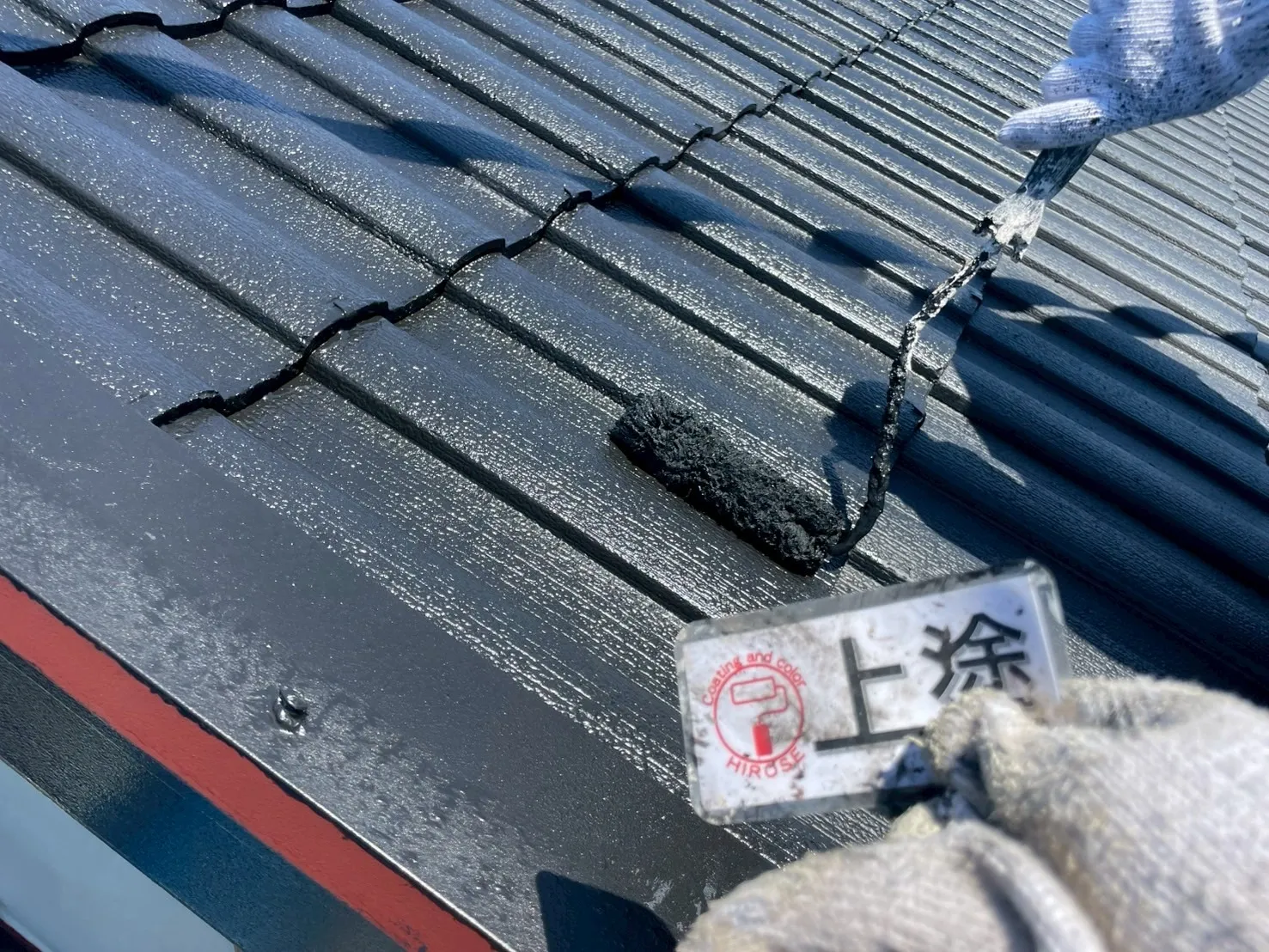 施工においては、まず下塗りに「水系パワーシーラー」をたっぷりと浸透させ、傷んだ屋根材を強化してから上塗りを行いました。色はK様ご指定の「黒」。屋根を深みのある黒で引き締めることで、家全体のシルエットに重厚感と安定感が生まれます。普段は見えない場所だからこそ、妥協のない最高品質の塗料と、基本に忠実な施工プロセスで、家を一番上から守り抜く覚悟を込めました。