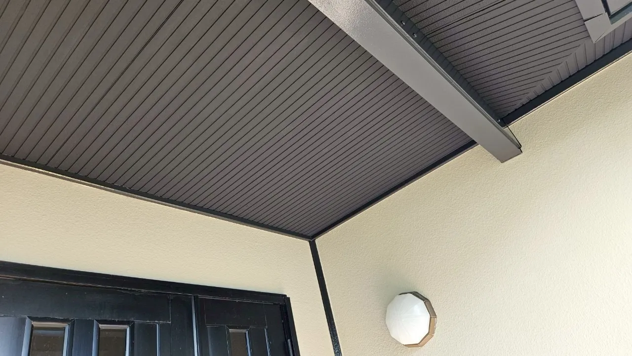 「神は細部に宿る」という言葉通り、家の美しさは外壁以外の「付帯部(ふたいぶ)」の仕上がりで決まります。軒裏、雨樋、破風板、雨戸といったパーツ類です。今回は、少し明るくした外壁色に対して、これらの付帯部を「黒」で統一しました。
