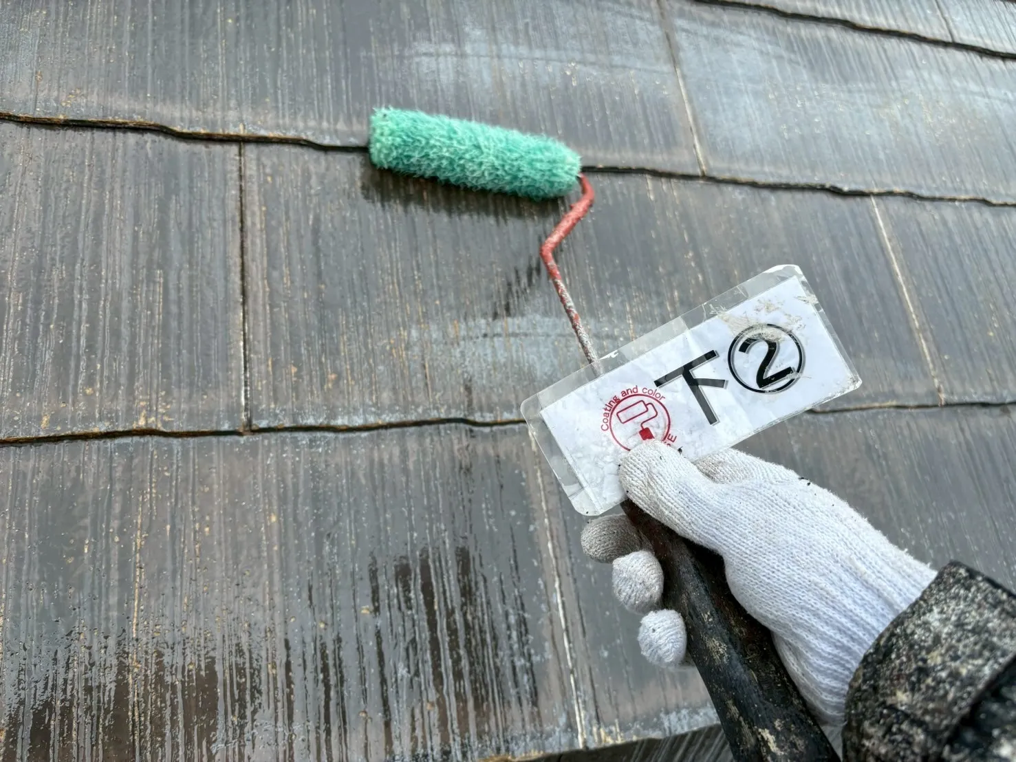 色褪せが気になっていた屋根には、落ち着いた「ナスコン色」の「ナノルーフ15」を採用しました。屋根は紫外線や雨風を最も受ける過酷な場所です。そのため今回は、耐久性を最大限に高めるために「下塗りを2回」行いました。これにより、上塗り塗料の密着性が格段に向上しています。