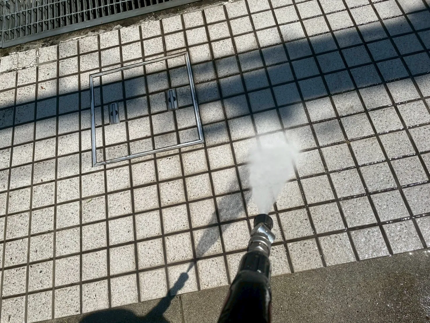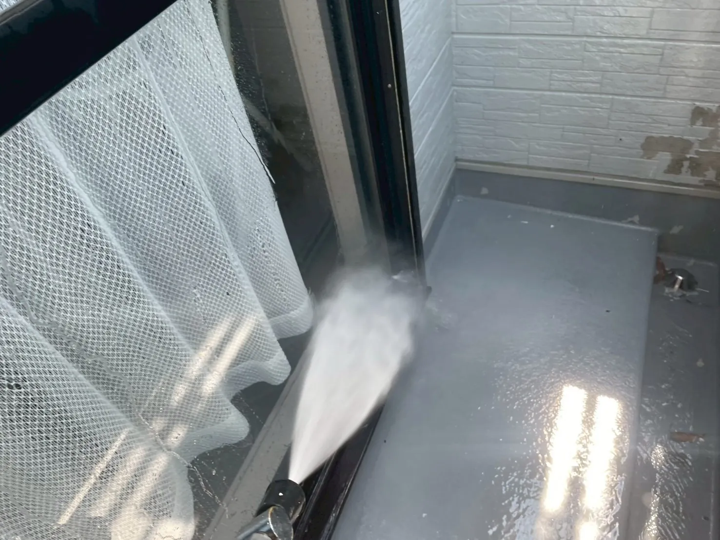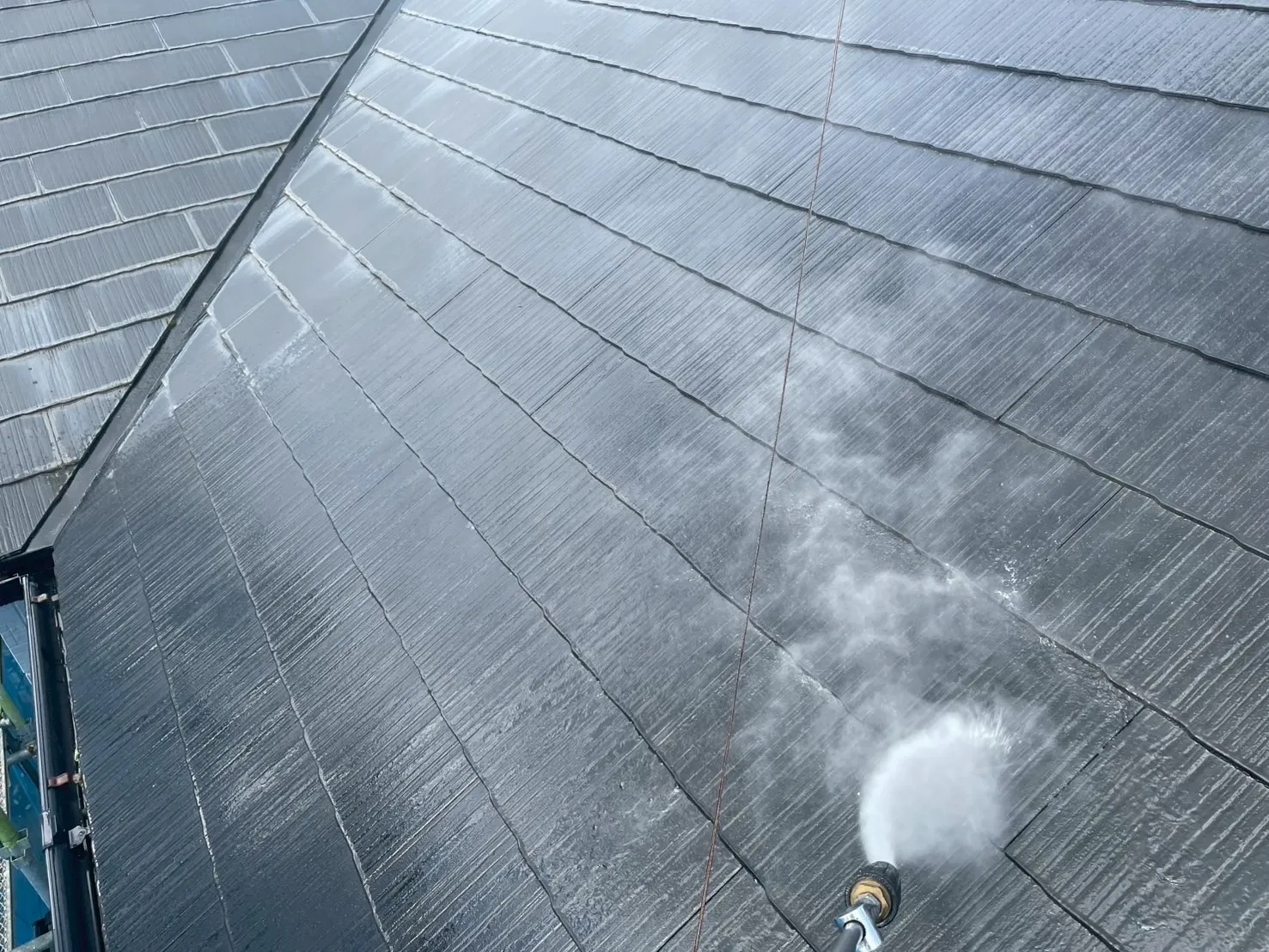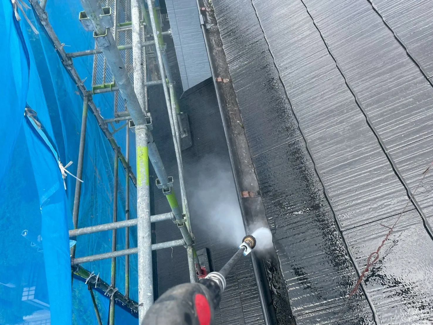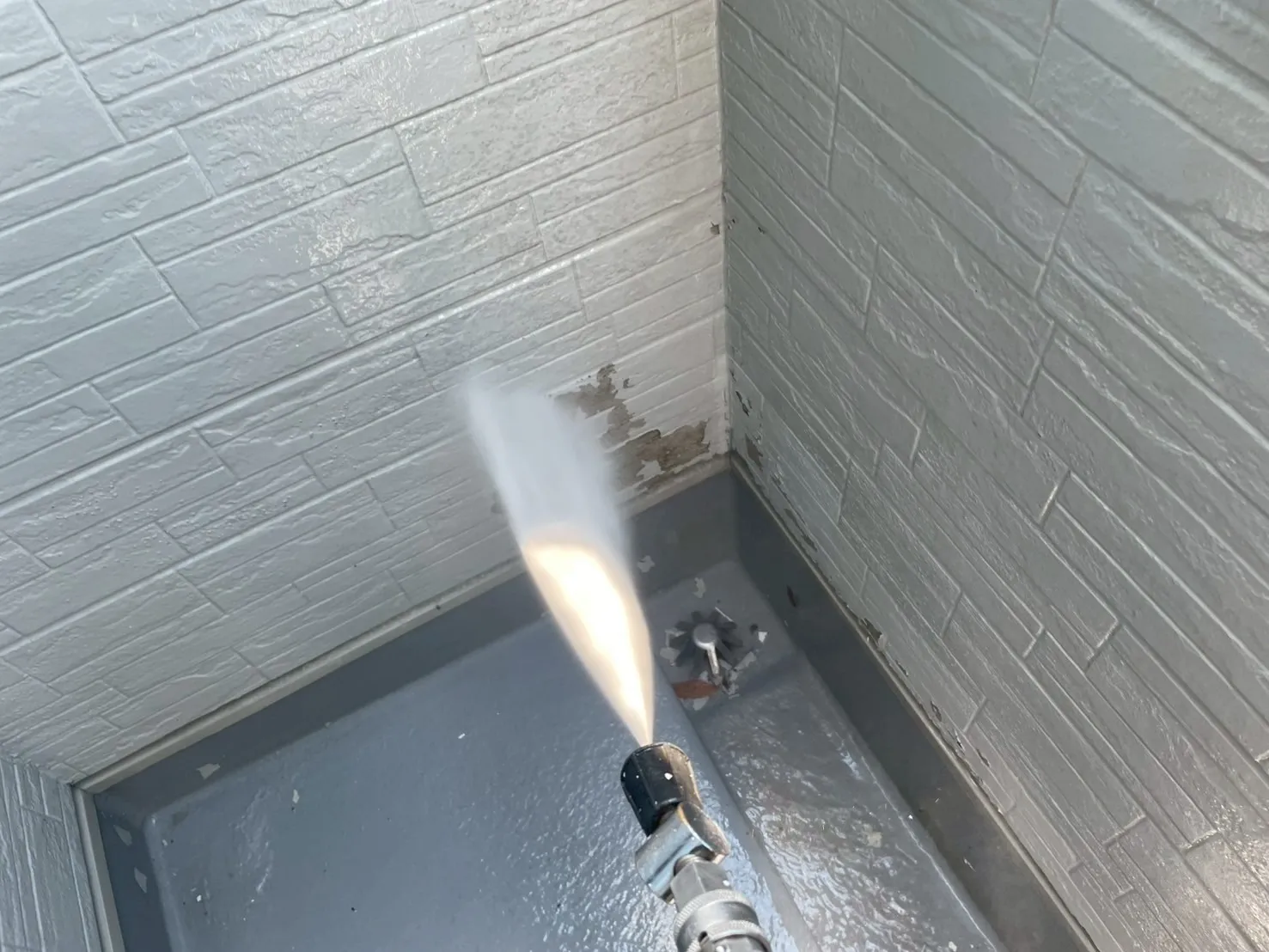塗装工事において、最も重要と言っても過言ではないのが、この「高圧洗浄」です。S様のお住まいは前回の塗装から19年が経過しており、一見きれいに見えても、長年の紫外線や雨風による汚れ、苔、古い塗膜が蓄積していました。これらを完全に除去せずに上から塗料を塗っても、すぐに剥がれてしまう原因になります。