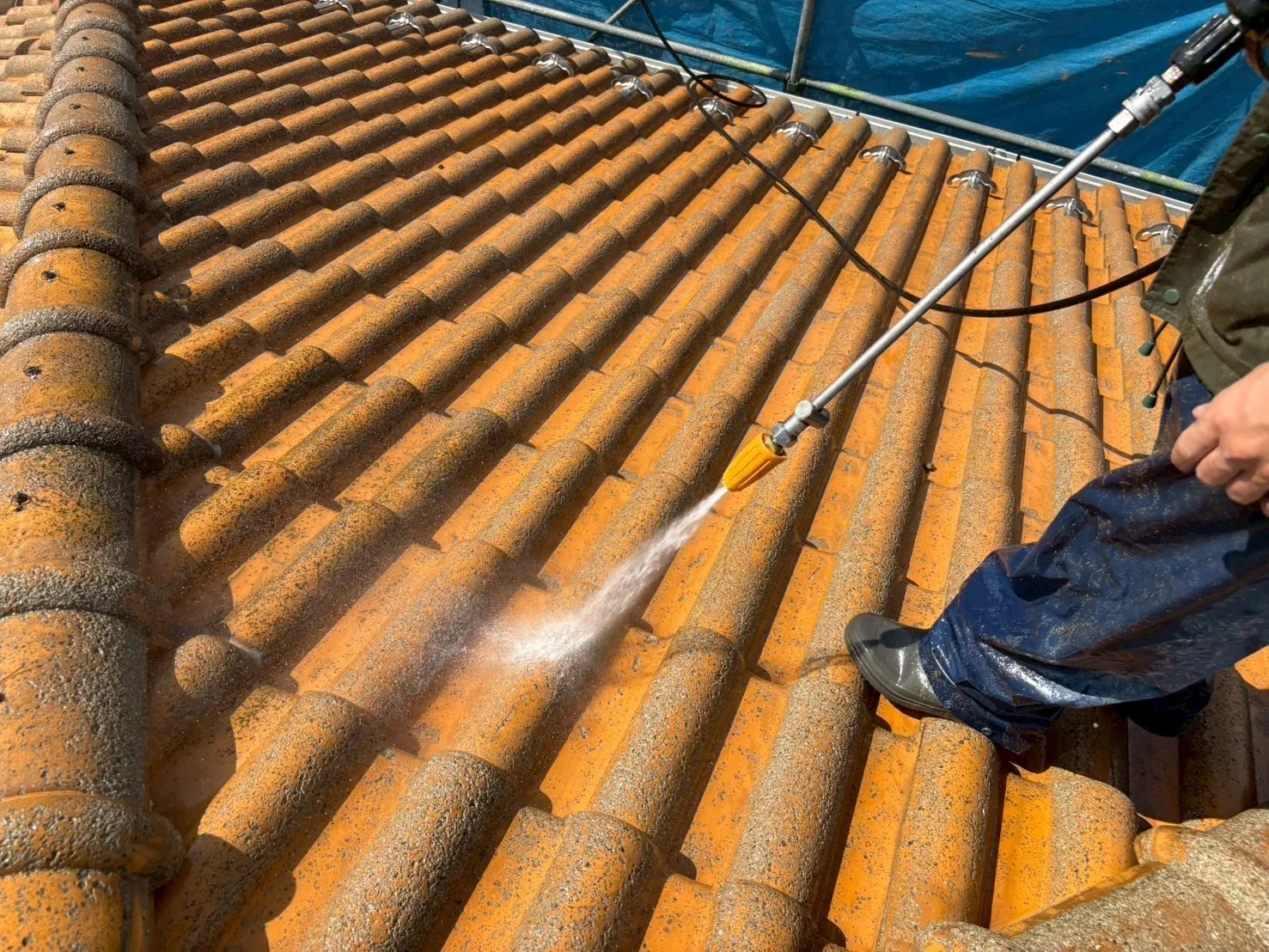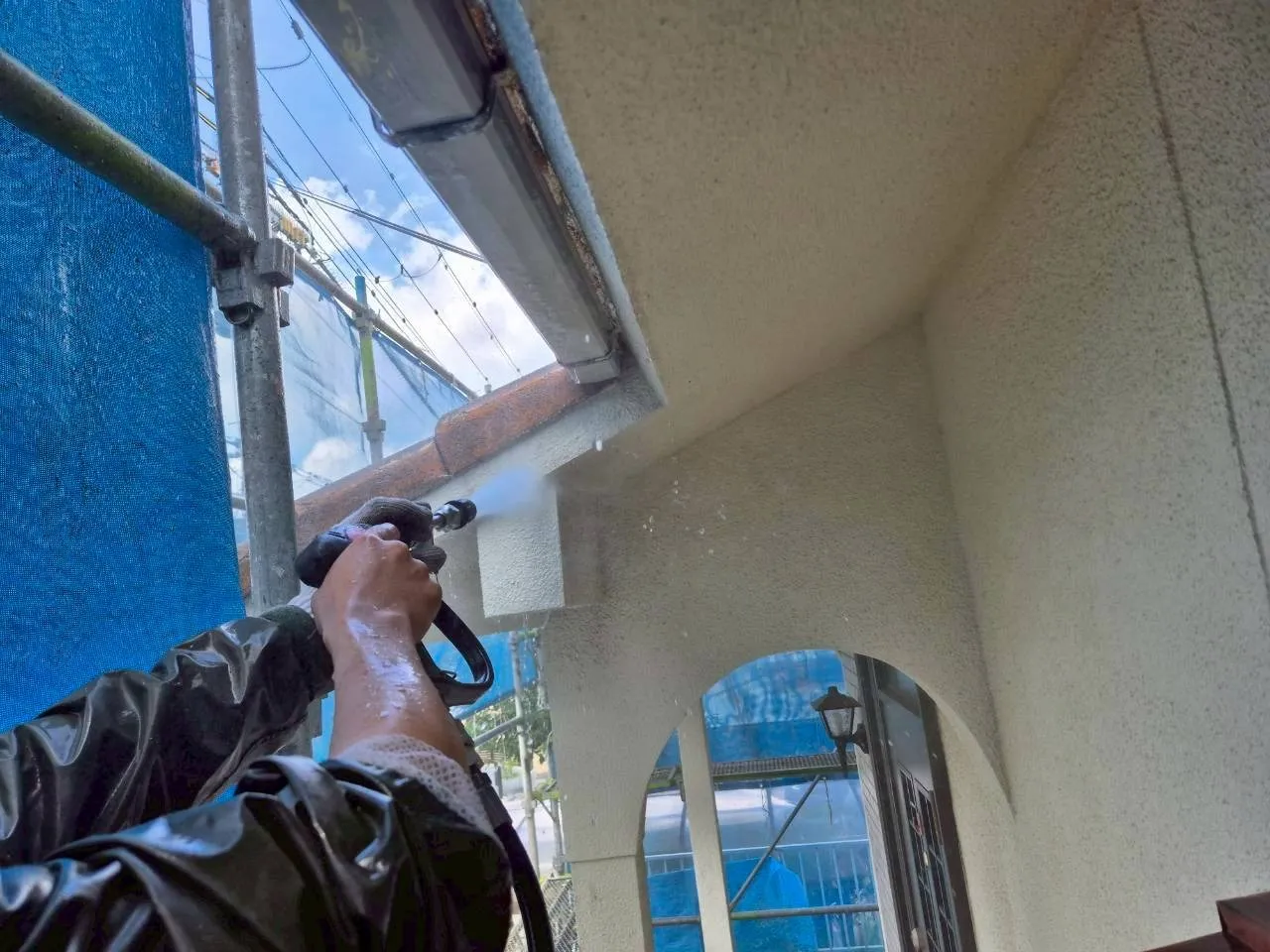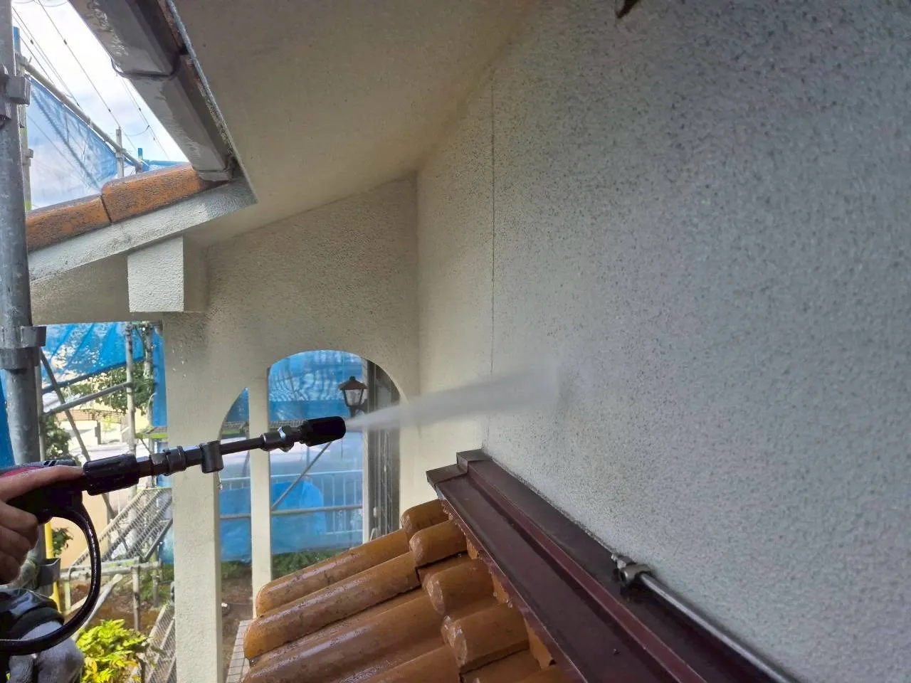 神戸市北区、築43年のお住まい。M様が弊社を選んでくださった一番の理由は、ご近所での「職人の仕事ぶり」をご覧になったことでした。その信頼を裏切らないよう、まずは高圧洗浄から取り掛かります。
