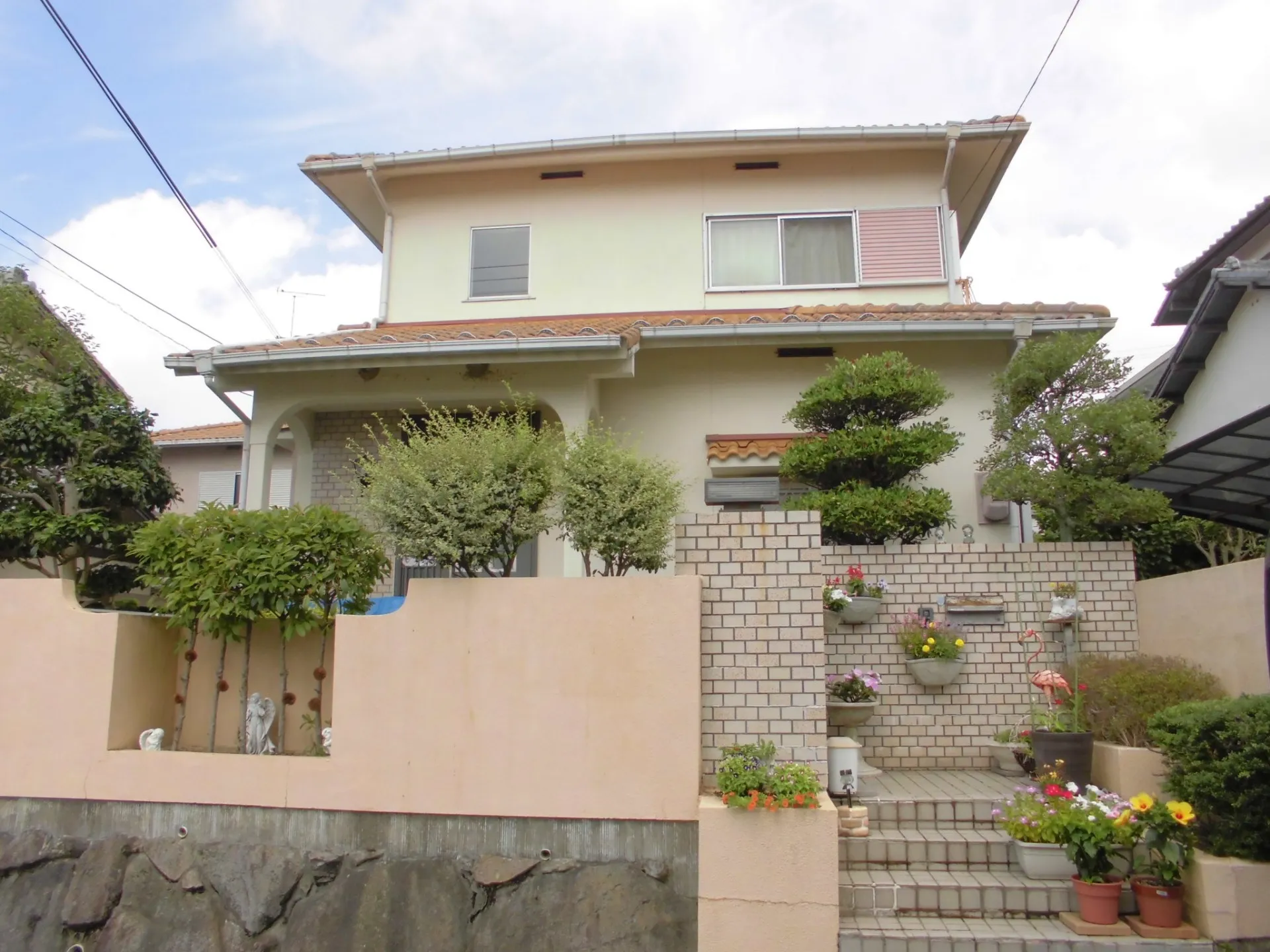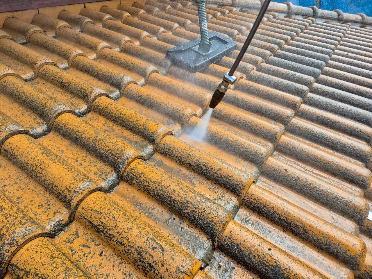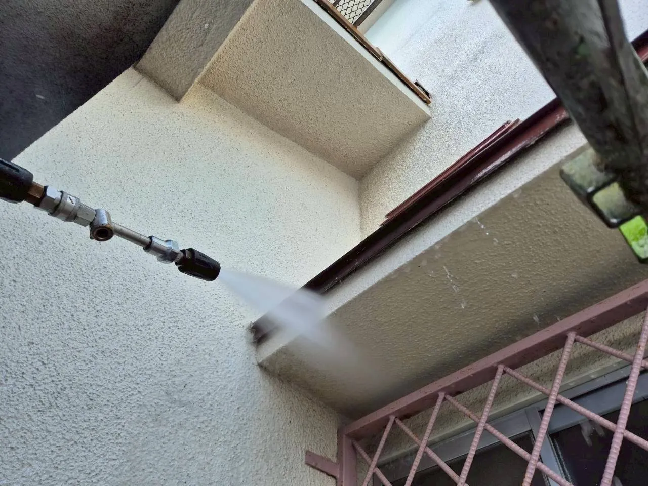 神戸市北区、築43年のお住まい。M様が弊社を選んでくださった一番の理由は、ご近所での「職人の仕事ぶり」をご覧になったことでした。その信頼を裏切らないよう、まずは高圧洗浄から取り掛かります。