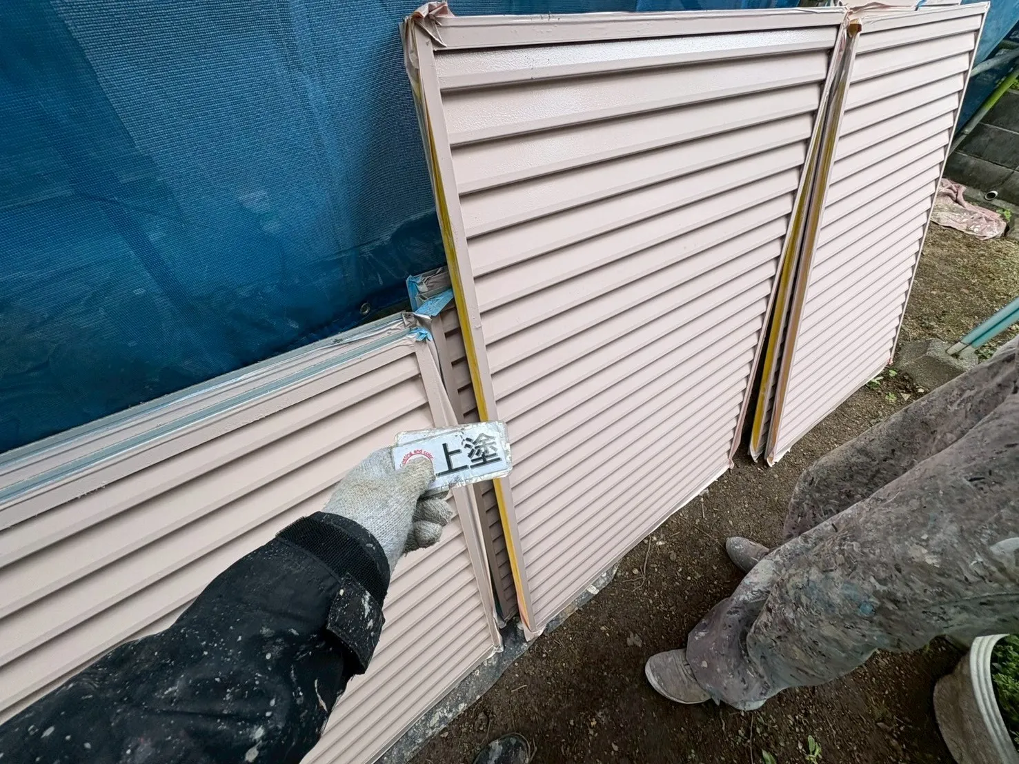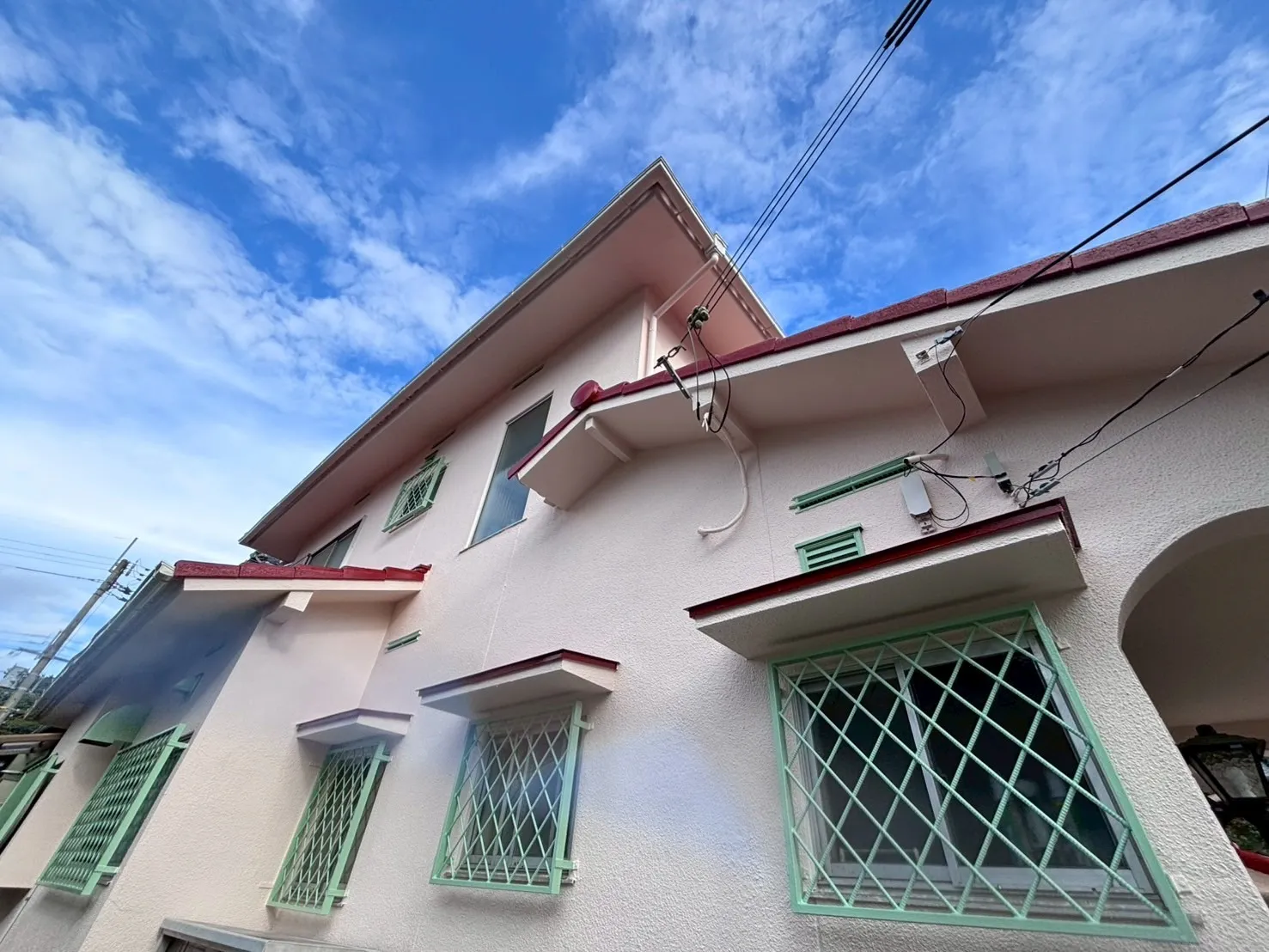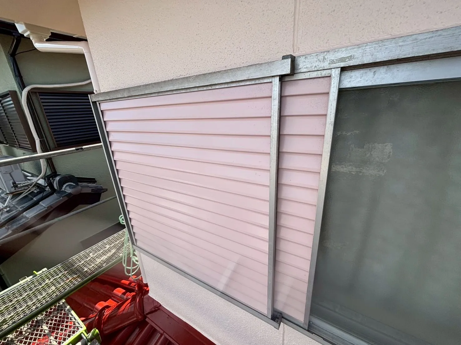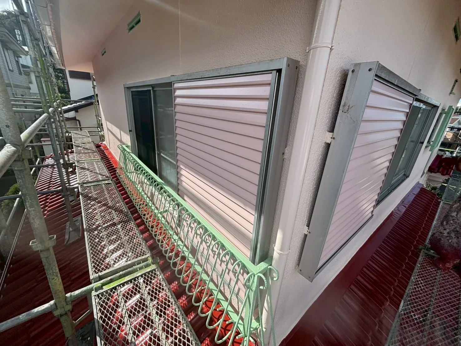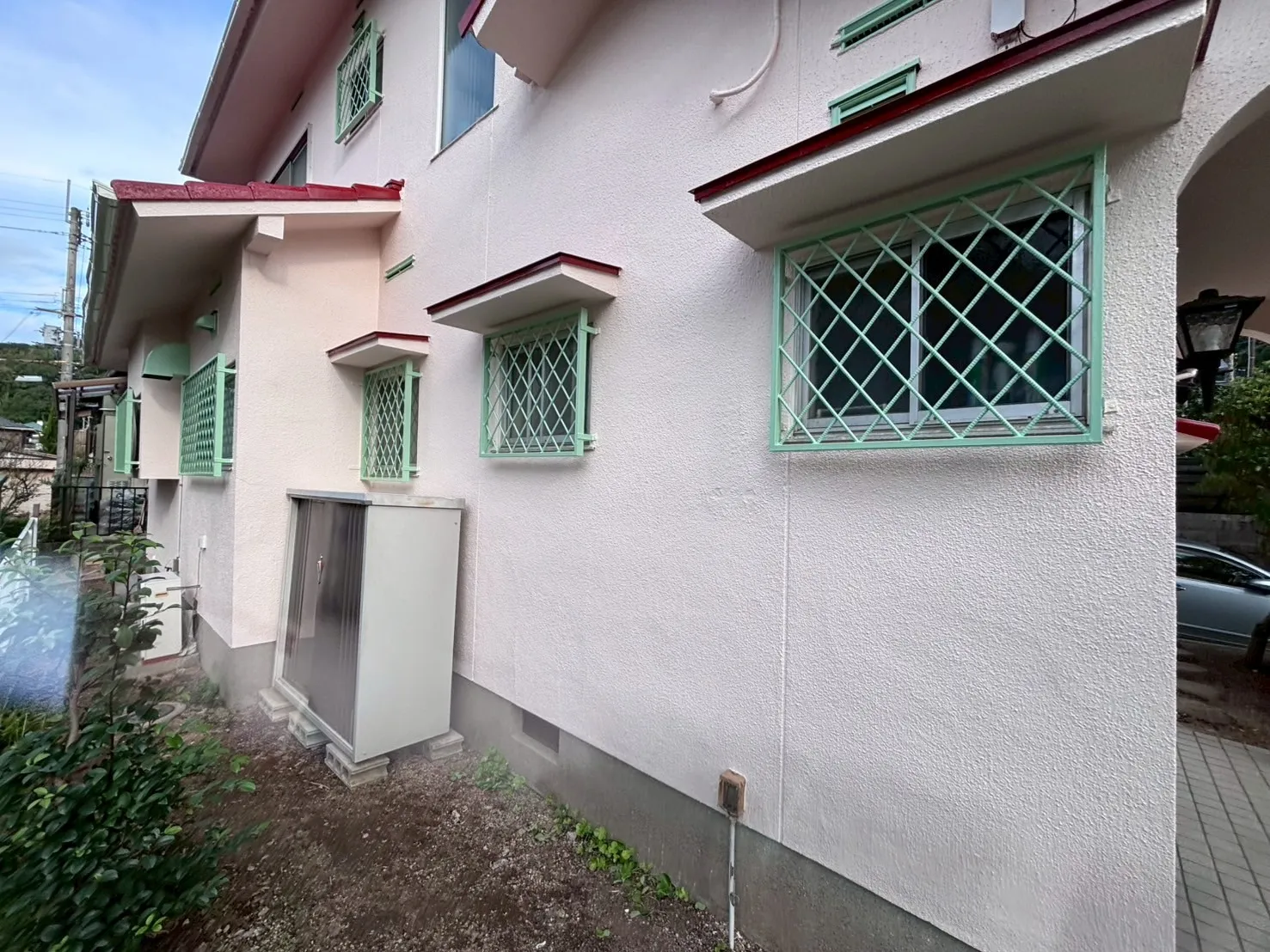また、雨戸の色にもこだわりがあります。「既存のピンク系の色が気に入っている」というお声を受け、既存の色に合わせて現場で調色を行いました。既製品の色をただ塗るのではなく、お客様の「好き」という感覚に寄り添い、色を作り出すことです。これも私たち職人の技術の見せ所になります。奥様の想いが詰まった、優しい外観へと生まれ変わりました。