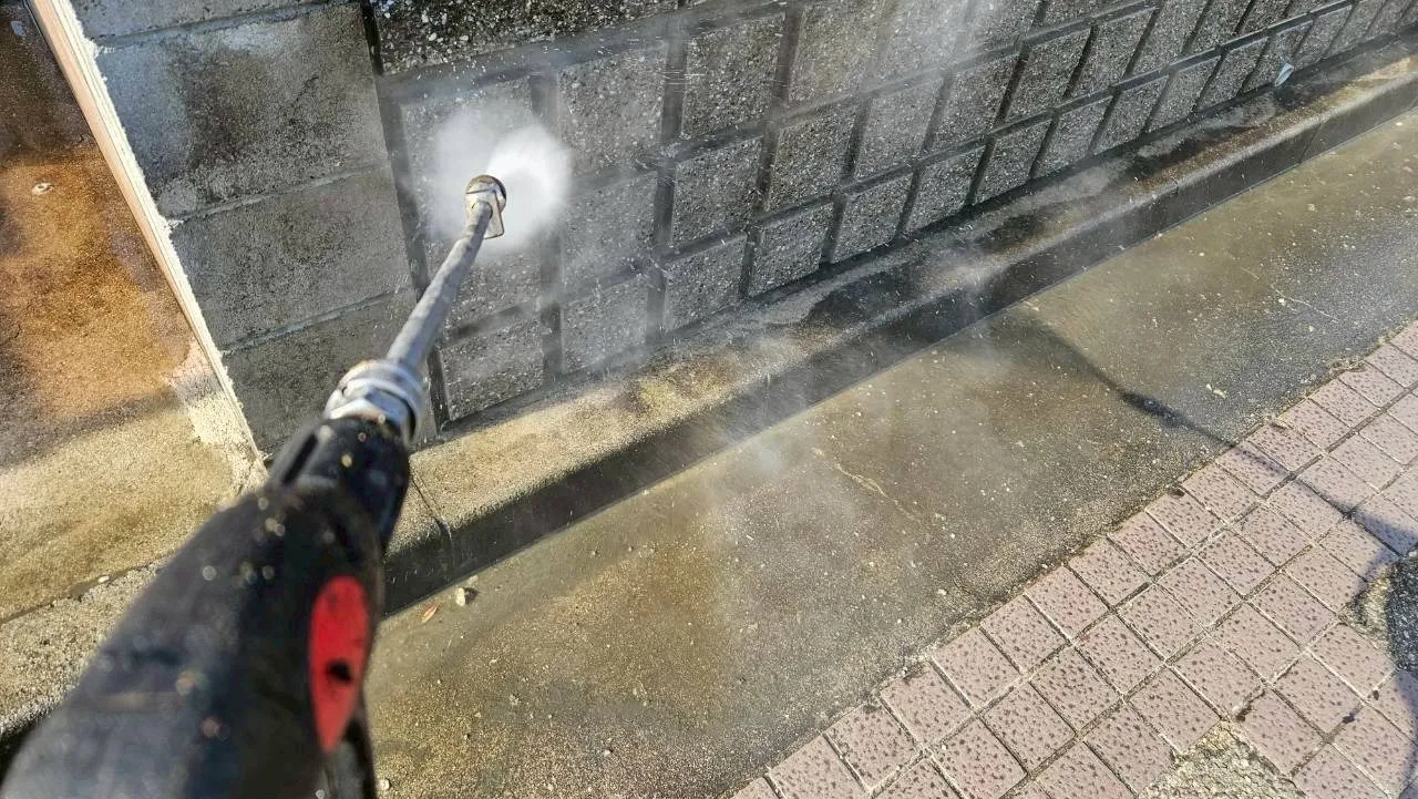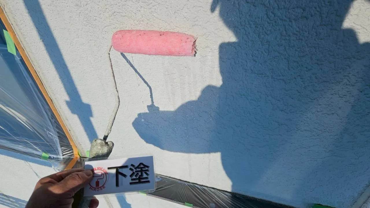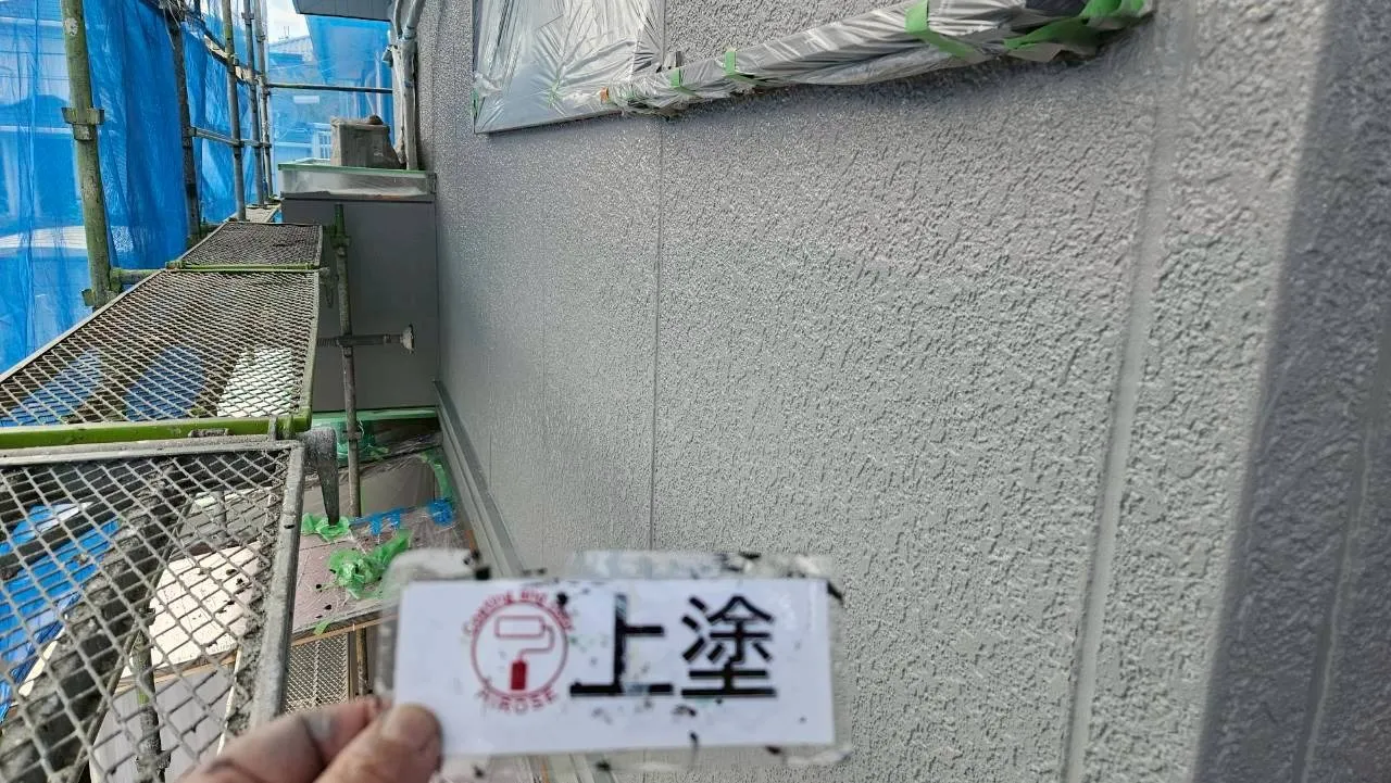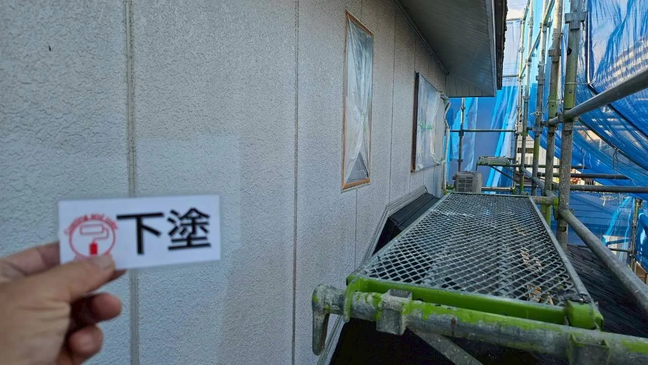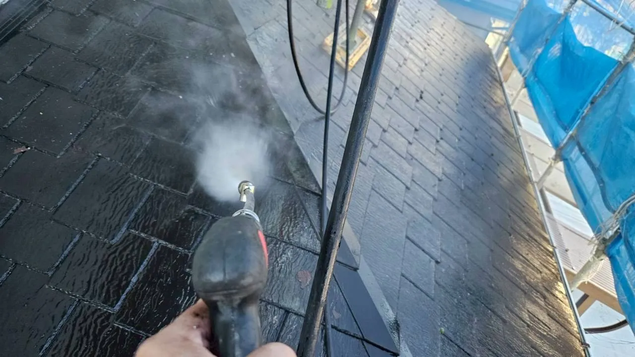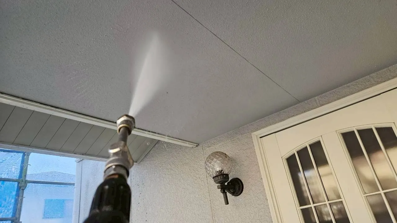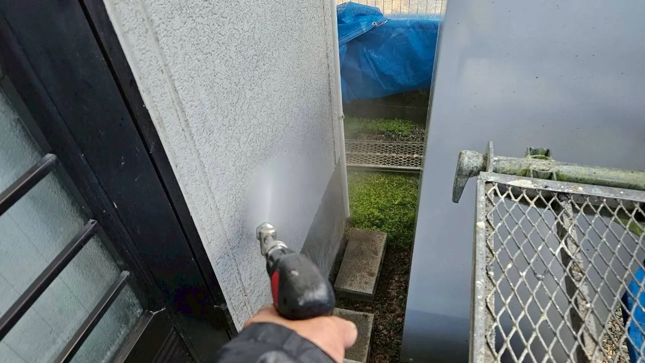 外壁塗装において、最も基礎となるのがこの高圧洗浄です。Y様のお宅は閑静な住宅街の一角にあり、周囲の環境によって蓄積された塵や埃、見えないカビなどが付着していました。これらを完全に除去しなければ、どんなに高品質な塗料を使用しても、本来の密着力を発揮することはできません。