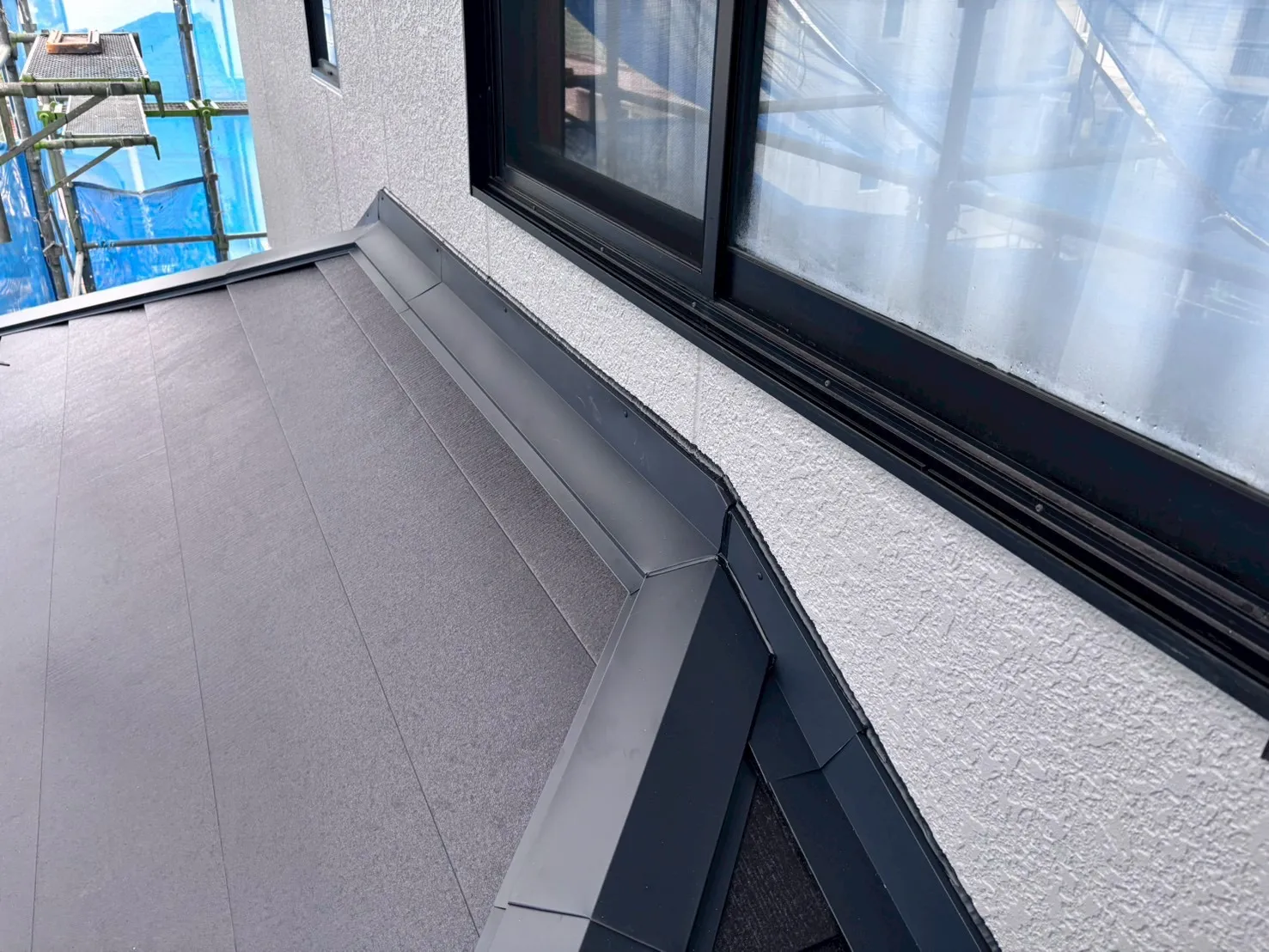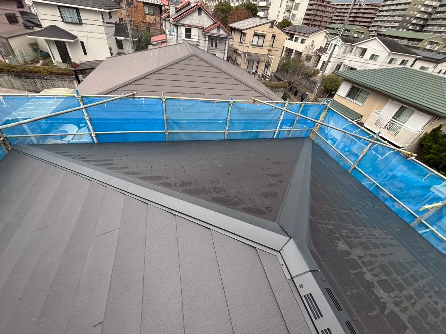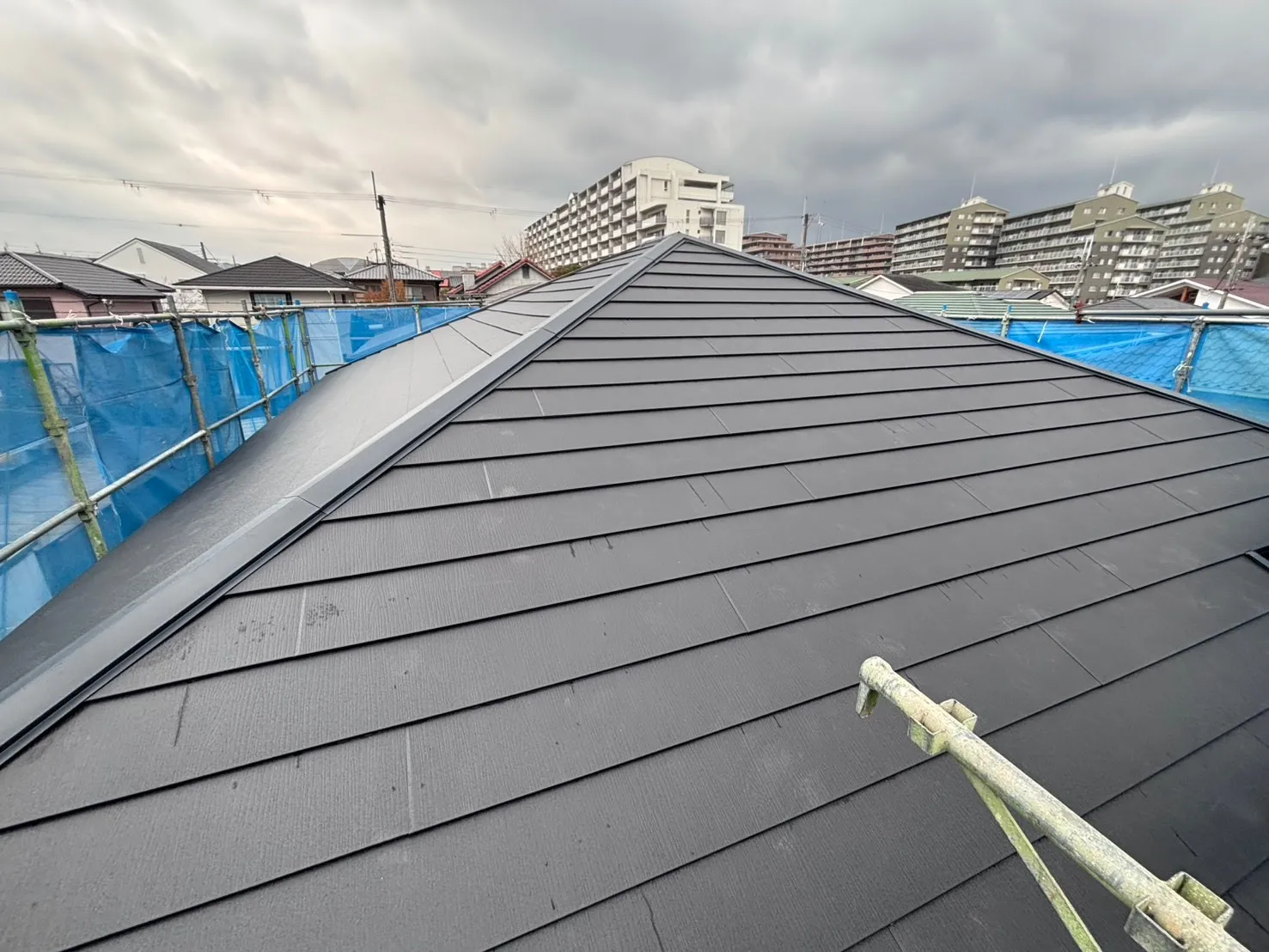 塗装では補いきれないほどの劣化が進行している場合、カバー工法は防水性と断熱性を劇的に向上させる最良の選択肢となります。軽量な素材であるため、建物への負担を最小限に抑えつつ、新築同様の耐久性を手に入れることができます。職人が一枚ずつ、隙間なく丁寧に組み上げていく作業は、まさに住まいの鎧を新調する工程です。チャコールグレーの重厚な屋根が、3分艶の外壁と見事に調和し、住まい全体をどっしりと引き締めてくれます。これで雨漏りや強風の心配も不要になり、Y様も「これで安心して暮らせる」と太鼓判を押してくださいました。
