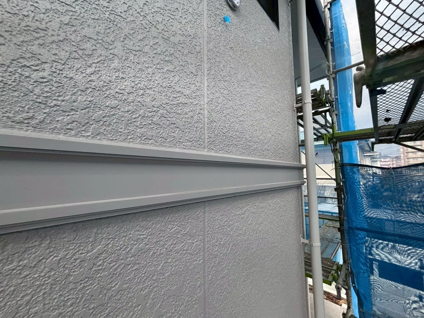 選ばれたのは、エスケー化研のエスケープレミアムシリコン。色は落ち着きのある「19-60A」を採用し、あえて艶を抑えた「3分艶」で仕上げました。ピカピカしすぎない、しっとりとしたマットな質感が、住宅地の中でも際立つ気品と高級感を演出します。職人が一塗り一塗り、想いを込めてローラーを転がすことで、均一で美しい平滑な面が生まれます。完成した外壁を目にされたY様の安堵した表情は、私たちにとって何よりの喜びです。「業者のススメ」から始まった計画が、いつしか「自分たちだけのこだわり」へと変わった瞬間でした。